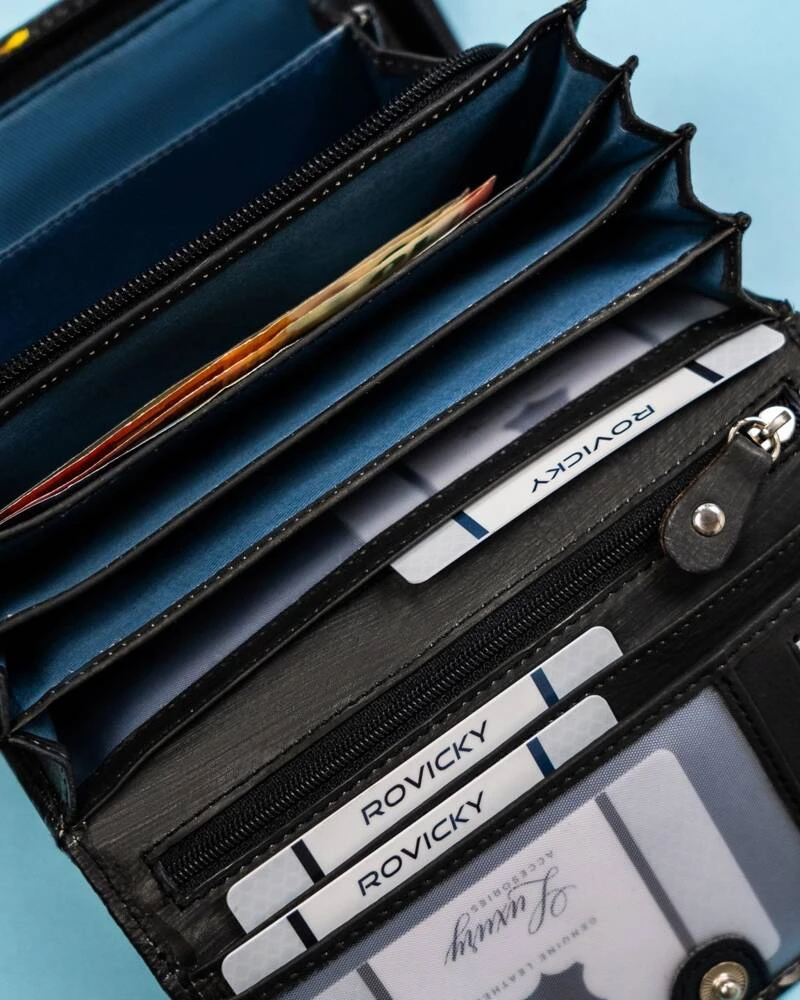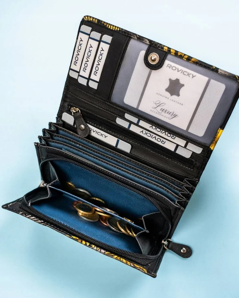- Pojemne wnętrze | Funkcjonalność na najwyższym poziomie. Dzięki ogromnej liczbie kieszonek i przegródek portfel pomieści wszystkie Twoje karty i dokumenty;