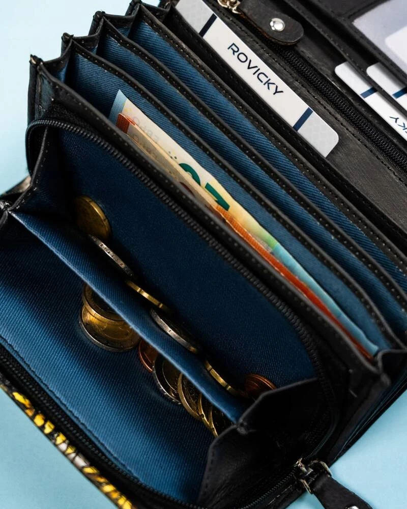 Dzięki liczebności schowków portfel idealnie nada się do przechowywania kilku walut. Bez problemu możesz je rozdzielić, aby nie uległy pomieszaniu.