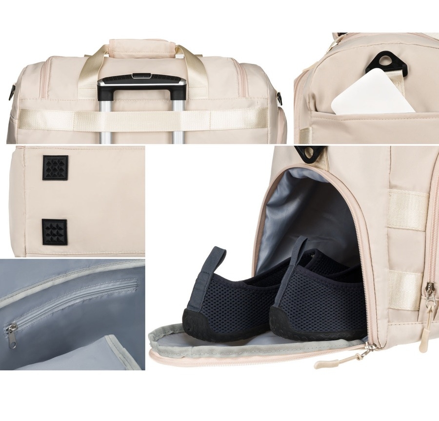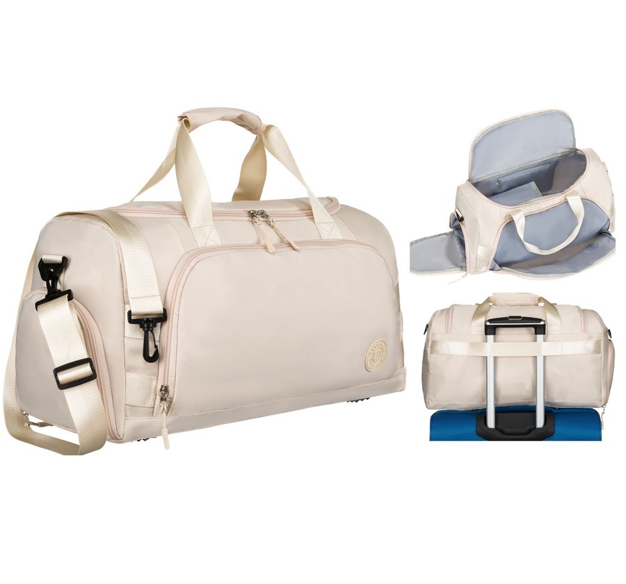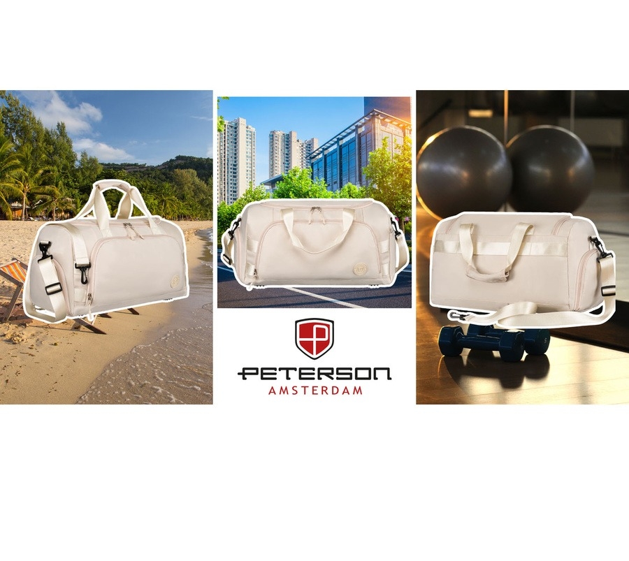Beżowa torba podróżna i na siłownię Peterson – pojemność 21 l, idealna na krótkie wyjazdy i treningi. Wyposażona w osobną komorę na buty, uchwyt na walizkę oraz regulowany pasek do 120 cm. Funkcjonalne wnętrze i kieszenie zewnętrzne ułatwiają przechowywanie drobiazgów, a solidne nóżki ochronne zapewniają wygodę i bezpieczeństwo podczas podróży.