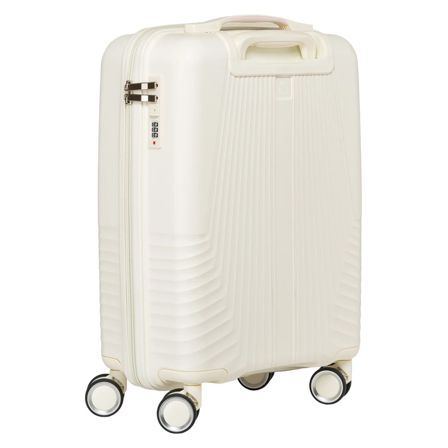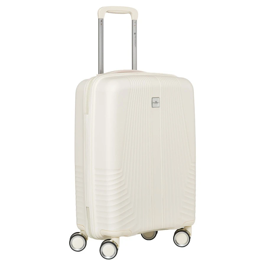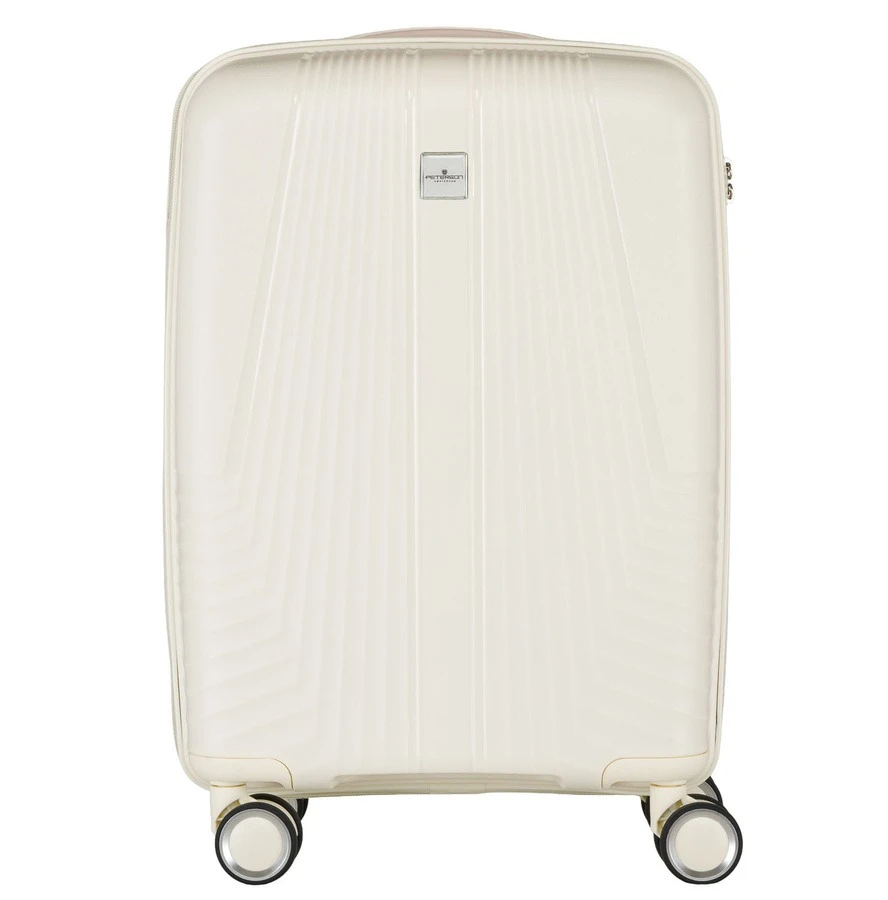 Beżowa walizka kabinowa Peterson 40L – mała, lekka, wodoodporna, z teleskopowym uchwytem i kółkami 360°