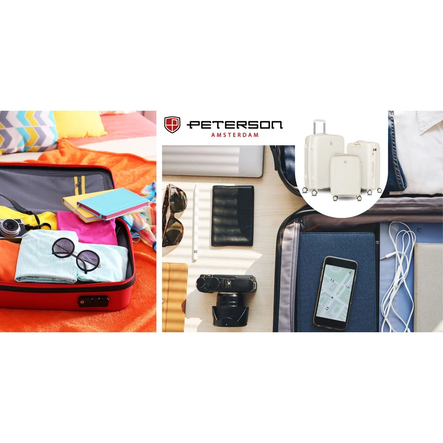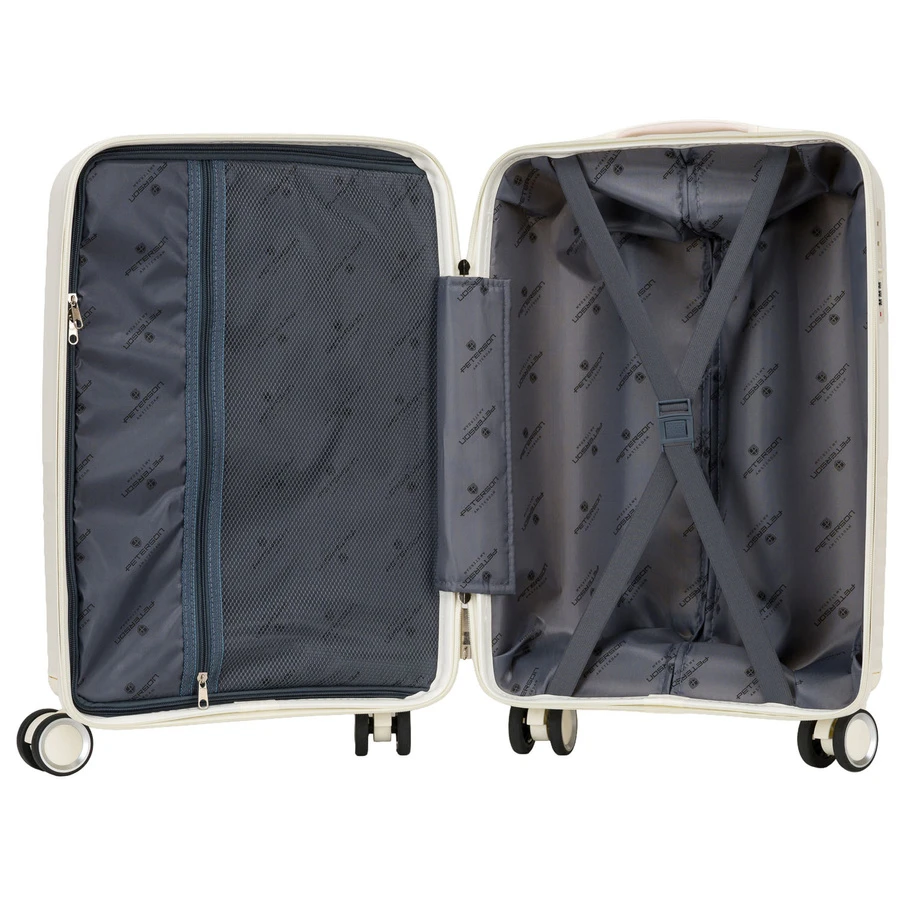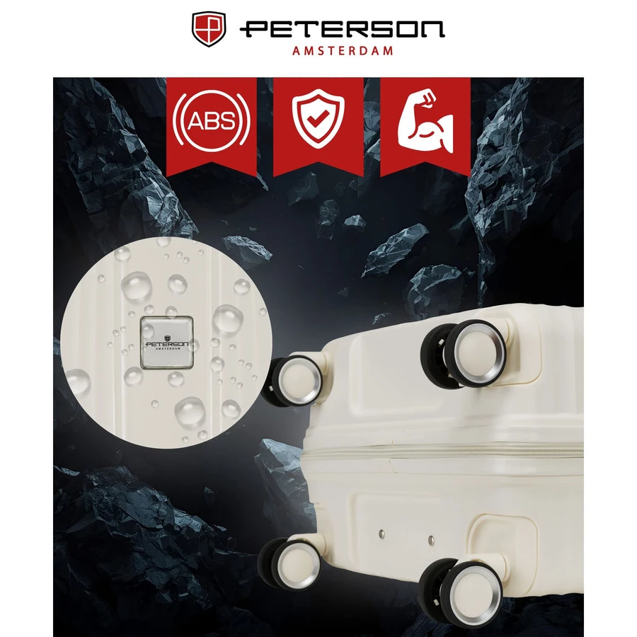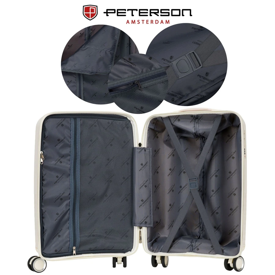 Beżowa kabinowa walizka Peterson 40L – lekka, wodoodporna i trwała walizka z ABS, wyposażona w teleskopowy uchwyt i obrotowe kółka 360°. Idealna na weekendowe i krótkie podróże, z praktycznym wnętrzem z przegrodami i pasami stabilizującymi bagaż. Zamek szyfrowy zapewnia bezpieczeństwo Twoich rzeczy. Komfortowa, funkcjonalna i stylowa – sprawdzi się w podróży zarówno dla kobiet, jak i mężczyzn.
