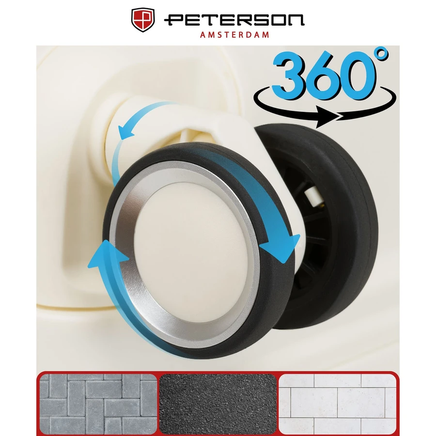 - Obrotowe kółka 360° – płynne i ciche prowadzenie walizki po każdej nawierzchni.