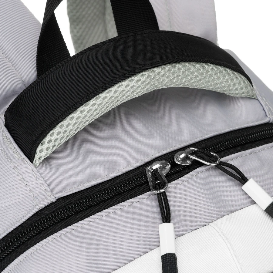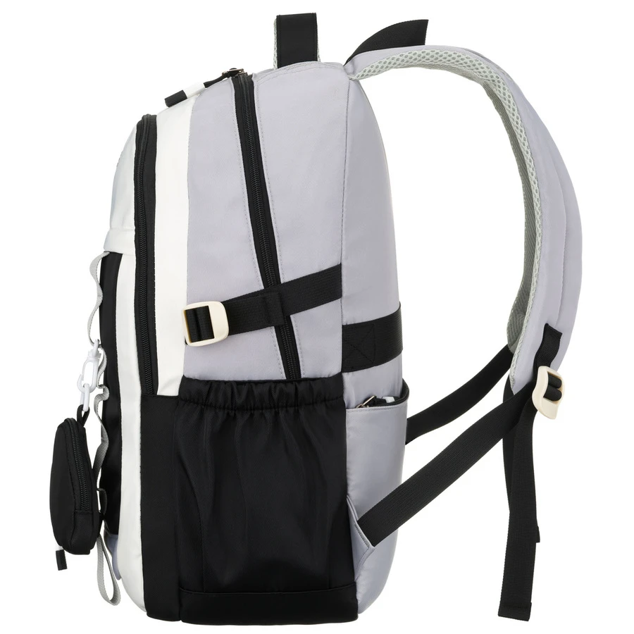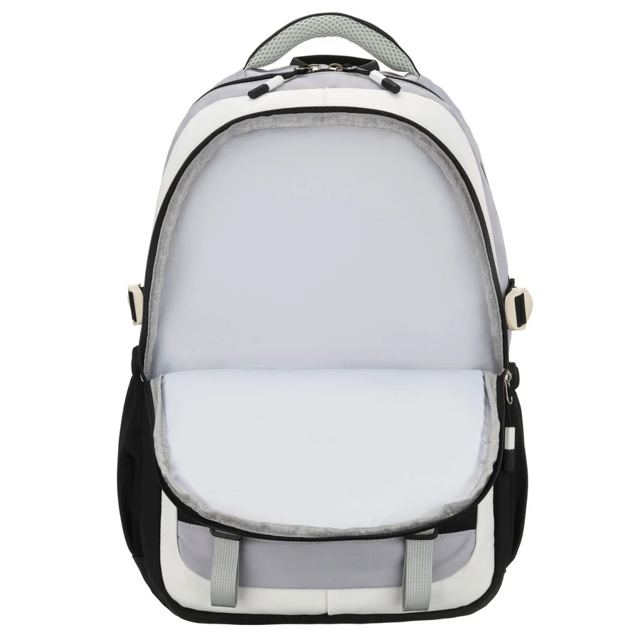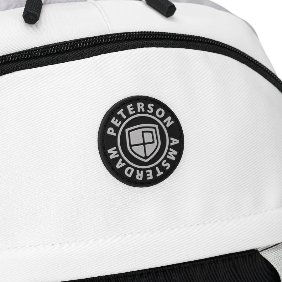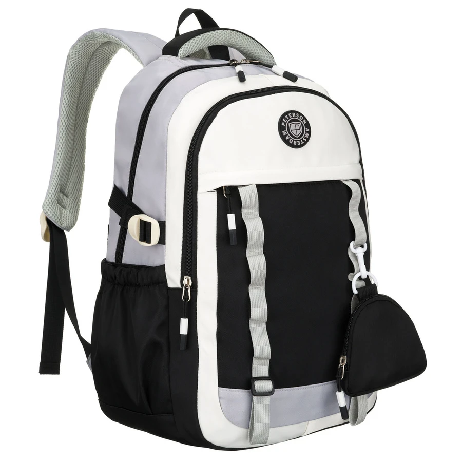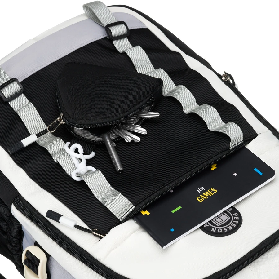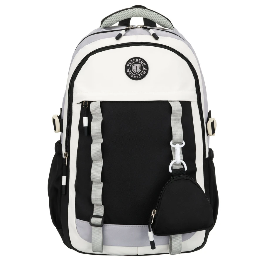 Białoczarny plecak szkolny Peterson wykonany z wytrzymałego, odpornego na wilgoć poliestru. Posiada 2 pojemne komory z przegrodą na laptopa lub dokumenty A4 oraz 5 praktycznych kieszeni, w tym ukrytą tylnią kieszonkę na cenne drobiazgi. W komplecie znajduje się poręczna mini-saszetka na drobiazgi. Komfort noszenia zapewniają miękko wyściełane szelki, regulowane pasy kompresyjne oraz pasek do mocowania na walizkę. Stylowy i funkcjonalny model dla uczniów na co dzień i w podróży.
