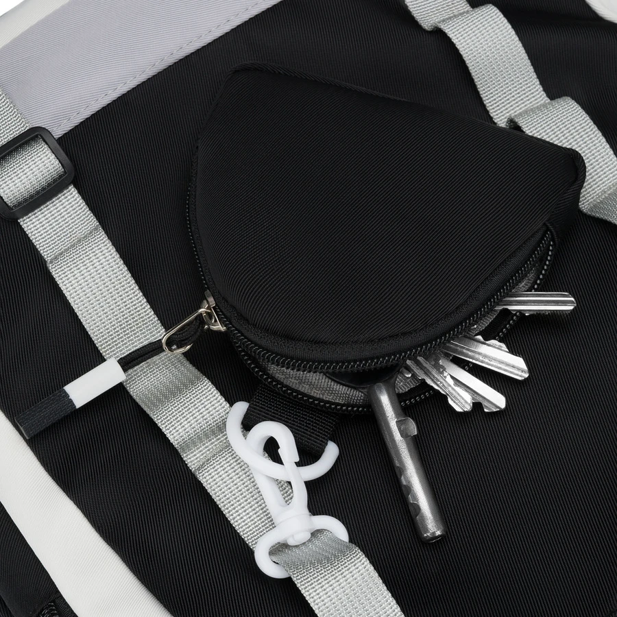 Do zestawu dołączono niewielką saszetkę zapinaną na suwak, mocowaną do przednich pasków plecaka. Doskonale sprawdzi się na klucze, monety, gumki do włosów czy inne drobiazgi, które warto mieć zawsze przy sobie.
