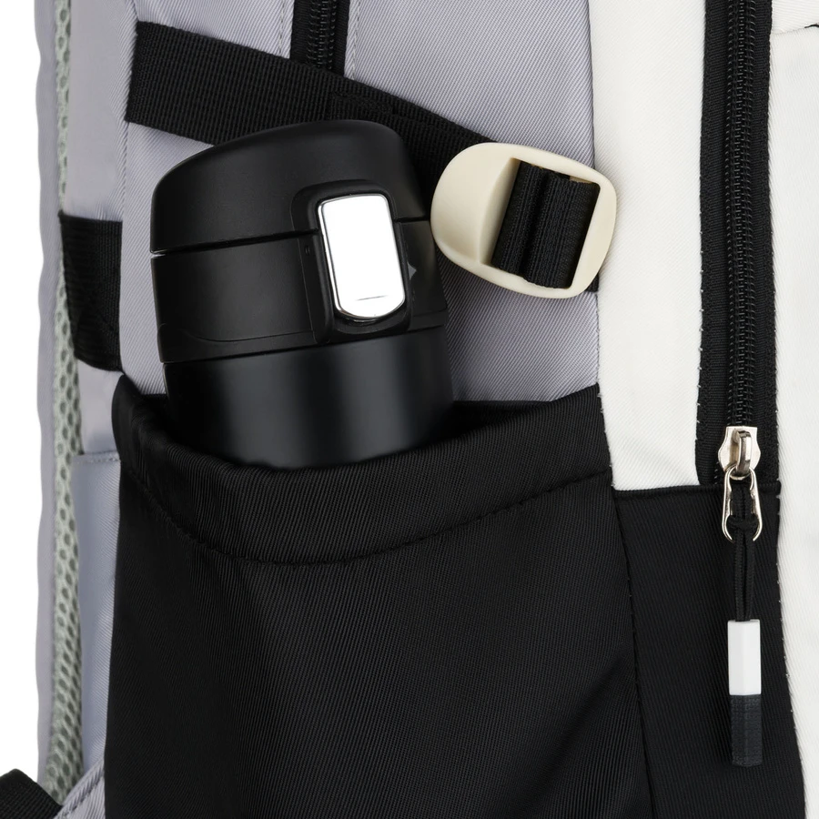 Zarówno po lewej, jak i prawej stronie plecaka znajdują się kieszonki z elastycznym wykończeniem, doskonałe na bidon, butelkę czy termos.