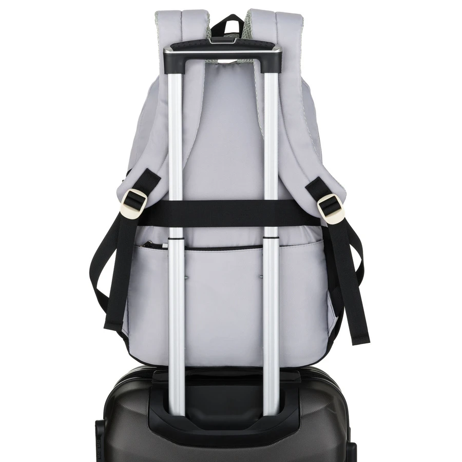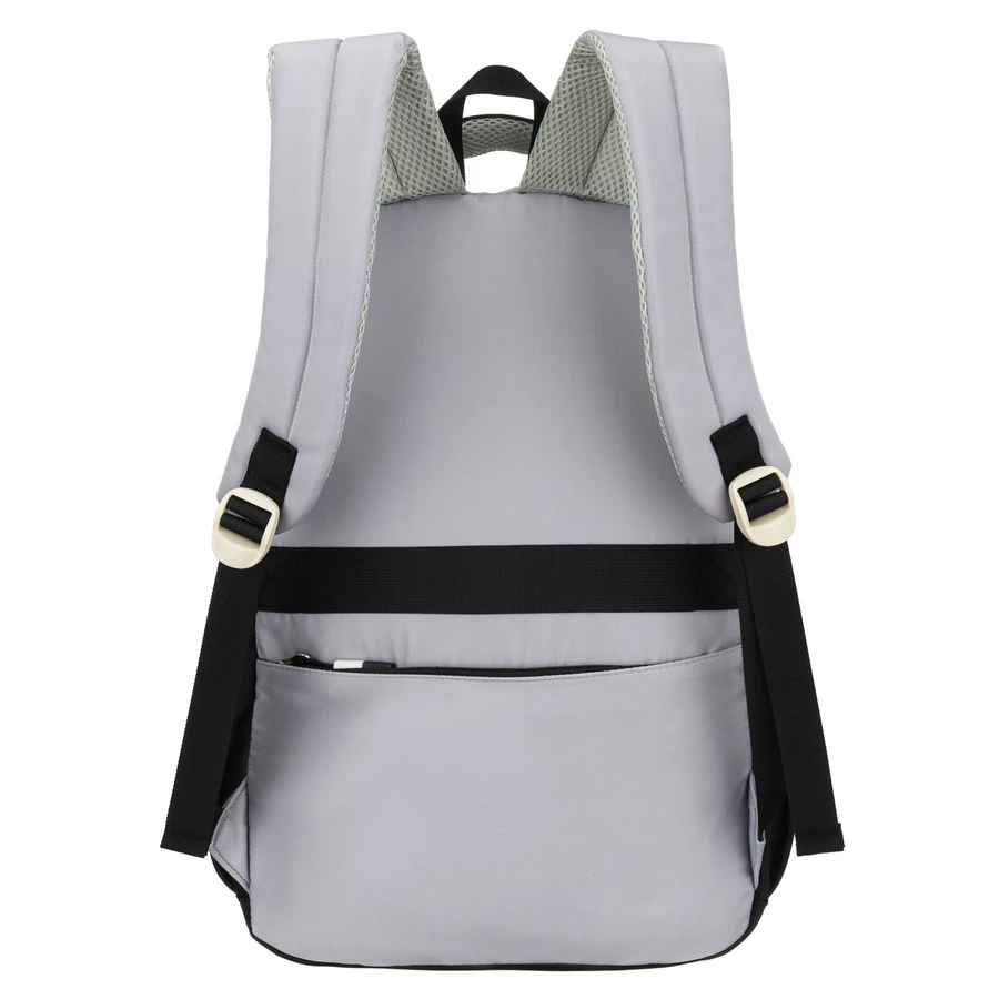 Specjalny pas z tyłu plecaka umożliwia wygodne nałożenie go na uchwyt walizki podróżnej. To funkcjonalna cecha, szczególnie przydatna podczas wycieczek szkolnych, podróży z rodziną czy kolonii.