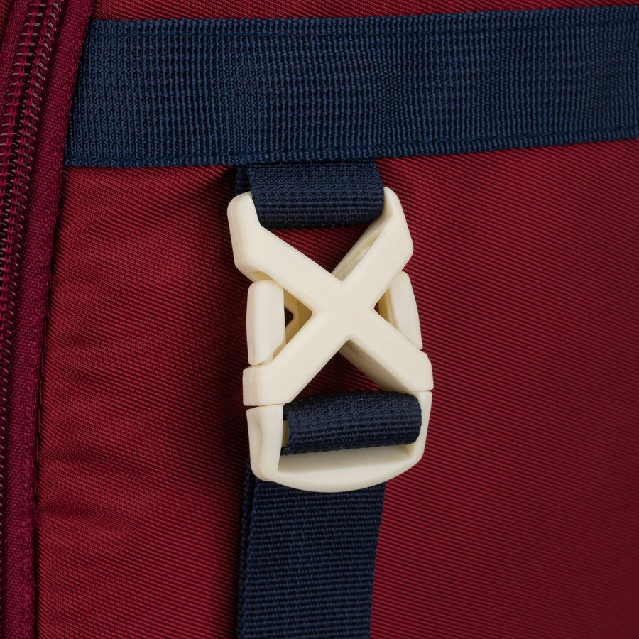 Z przodu znajdują się dwa paski z klamrami, które umożliwiają przypięcie zrolowanej bluzy, lekkiej kurtki lub maty. Dzięki temu dziecko nie musi upychać odzieży do środka – wszystko ma swoje miejsce.