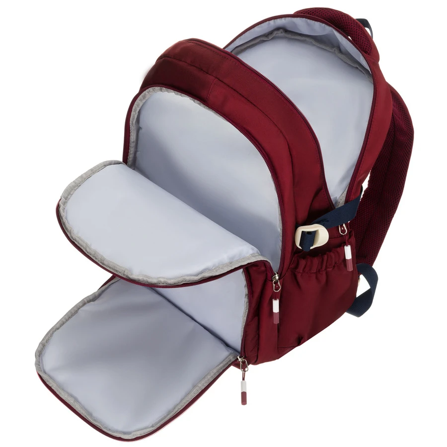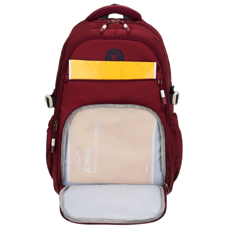 Bordowy plecak szkolny z poliestru wyposażony w boczne pasy kompresyjne - Peterson
