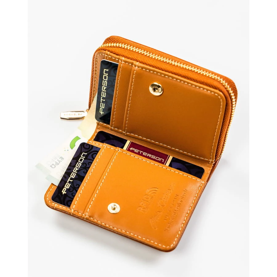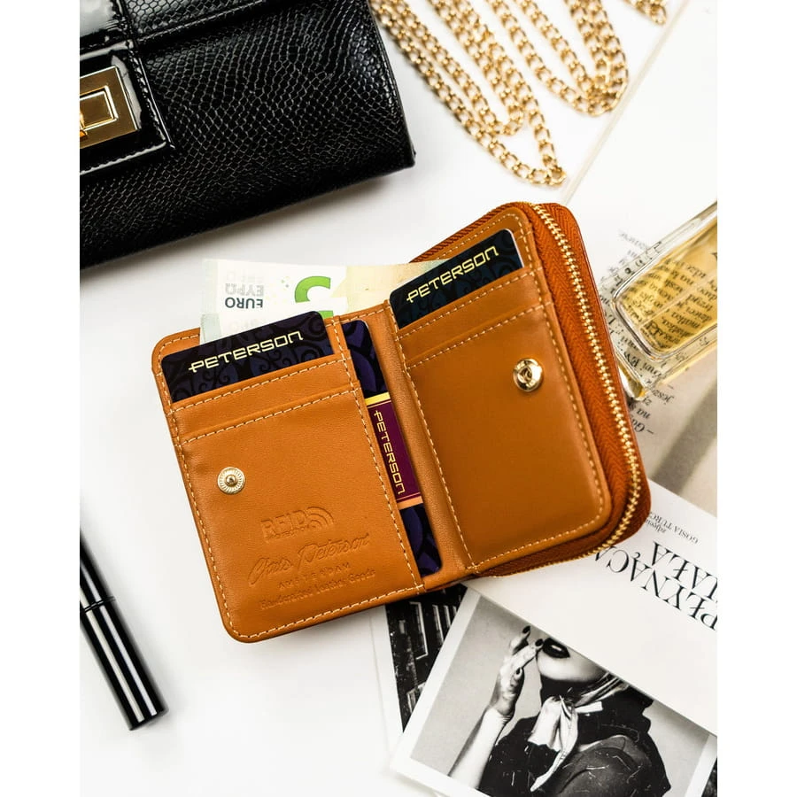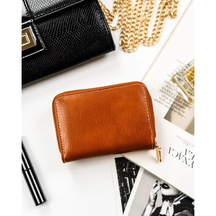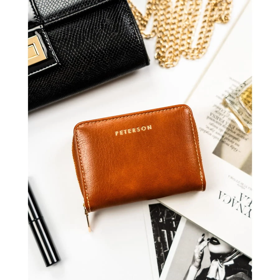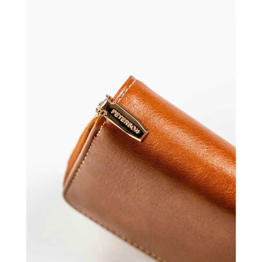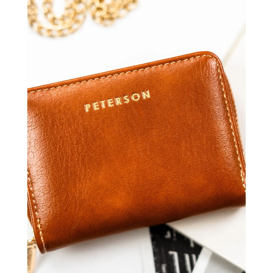 Brązowy portfel damski ze skóry ekologicznej zamykany na suwak i zatrzask - Peterson