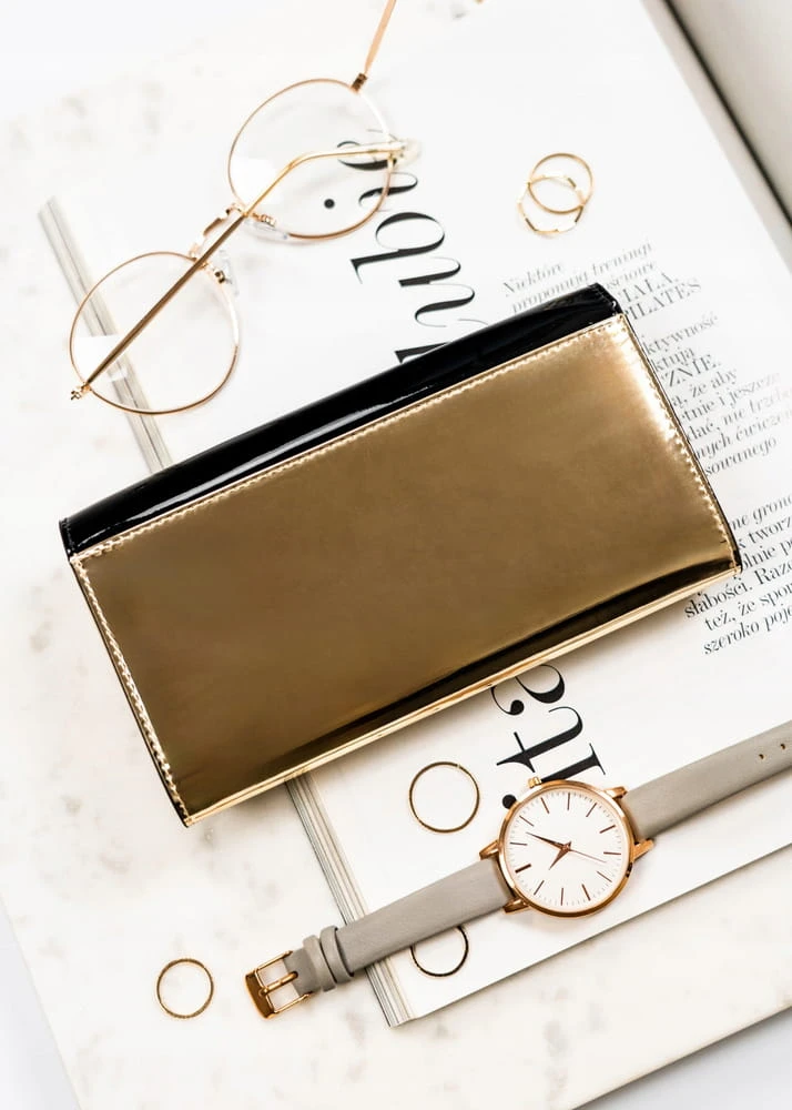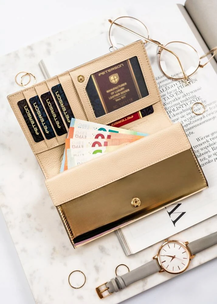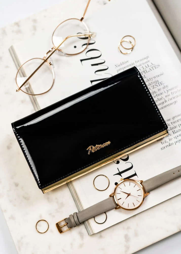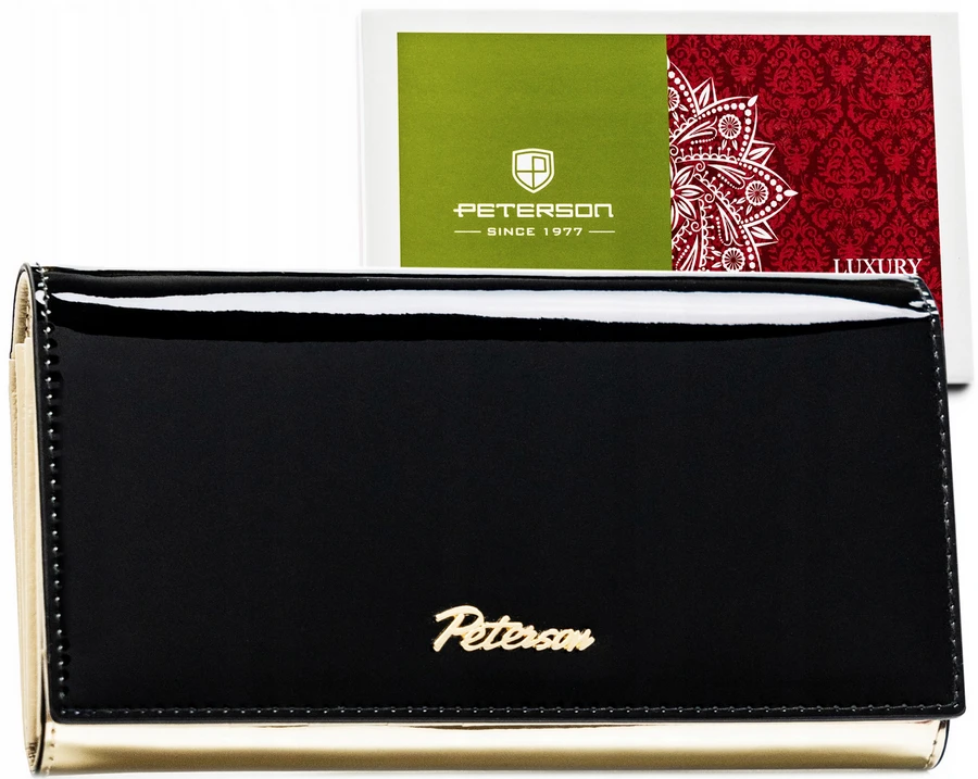 Czarno-złoty, elegancki portfel damski zamykany na zatrzask - Peterson