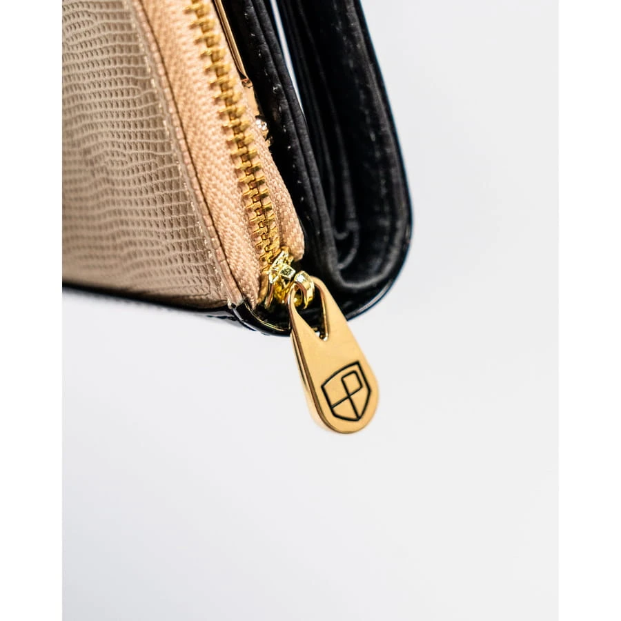 - Skóra naturalna | Portfel ma elegancki, dwukolorowy design, łączący połyskującą czerń z delikatnym złotem. Górna część portfela jest wykonana z błyszczącego, lakierowanego materiału w głębokim czarnym odcieniu, który nadaje mu luksusowy charakter.
