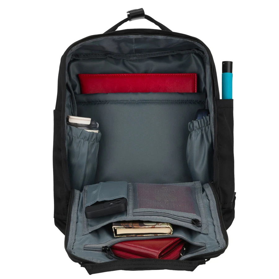 Wnętrze plecaka wyposażono w wyściełaną przegrodę o wymiarach 29 × 24 cm, która świetnie sprawdzi się jako miejsce na laptopa, tablet lub inne urządzenia przenośne. Po obu stronach znajdują się dwie elastyczne kieszenie wewnętrzne, idealne na bidon, termos lub ładowarkę.