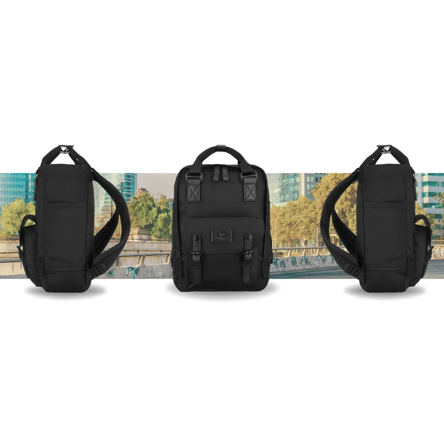 Praktyczne szelki zapewniają wygodę nawet przy dłuższym użytkowaniu. Górny uchwyt pozwala na wygodne noszenie plecaka w dłoni lub szybkie przenoszenie go w sytuacjach, gdy nie chcesz zakładać go na ramiona.