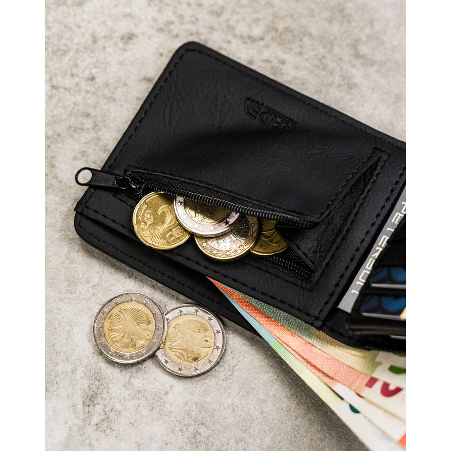 - Praktyczna kieszeń na bilon zapinana na suwak.