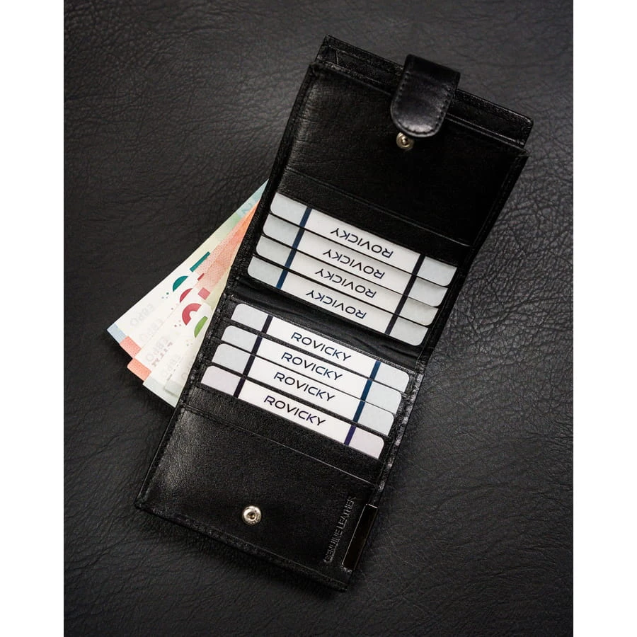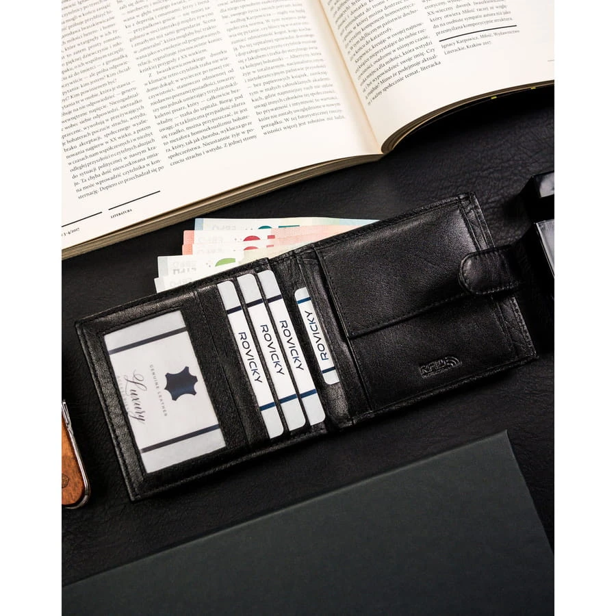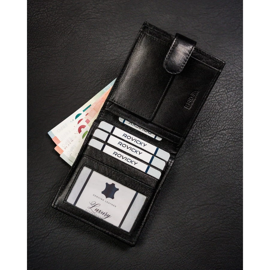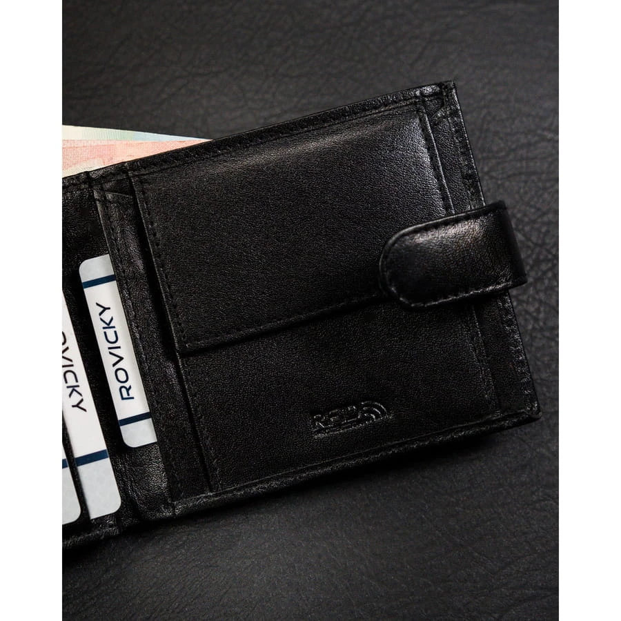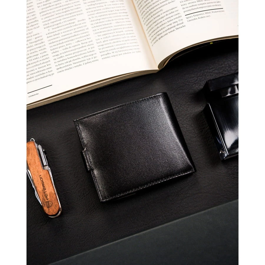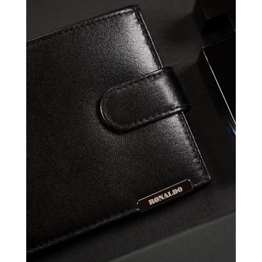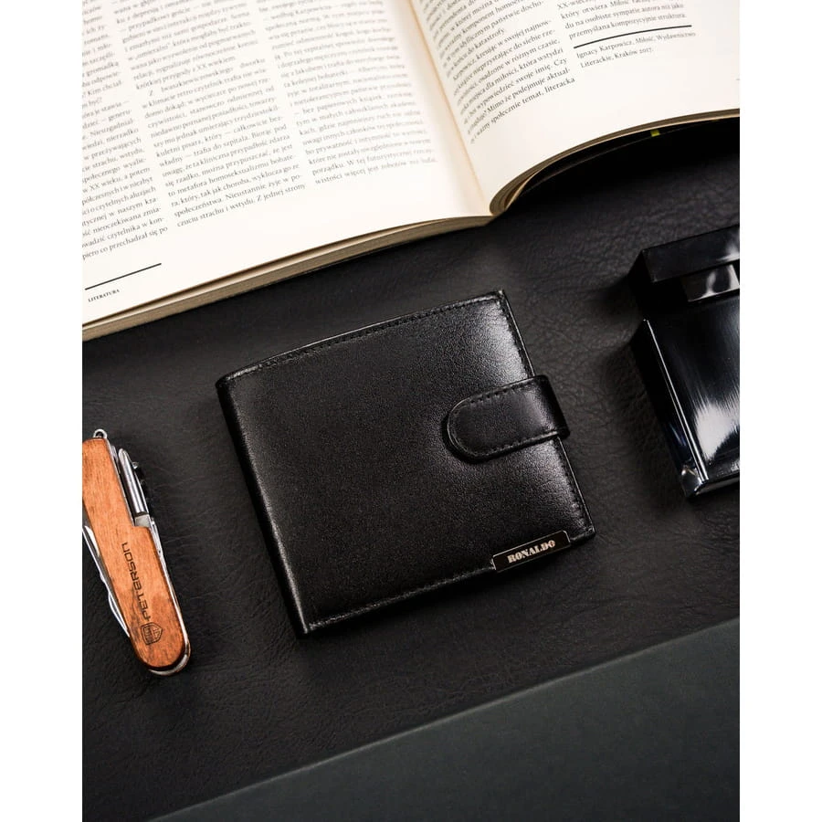 Czarny, poziomy, pojemny portfel męski ze skóry naturalnej zamykany zatrzaskiem - Ronaldo