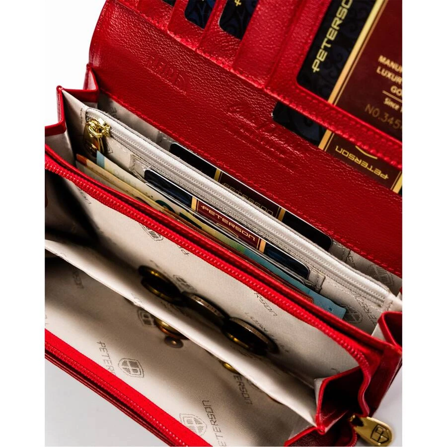 Stylowy i funkcjonalny portfel damski Peterson wykonany z wysokiej jakości skóry naturalnej i lakierowanej w czerwonym kolorze. Eleganckie złote okucia podkreślają jego luksusowy charakter, a pozioma orientacja sprawia, że portfel jest wygodny w codziennym użytkowaniu. Idealny dla kobiet ceniących praktyczne rozwiązania, bezpieczeństwo i modny design.