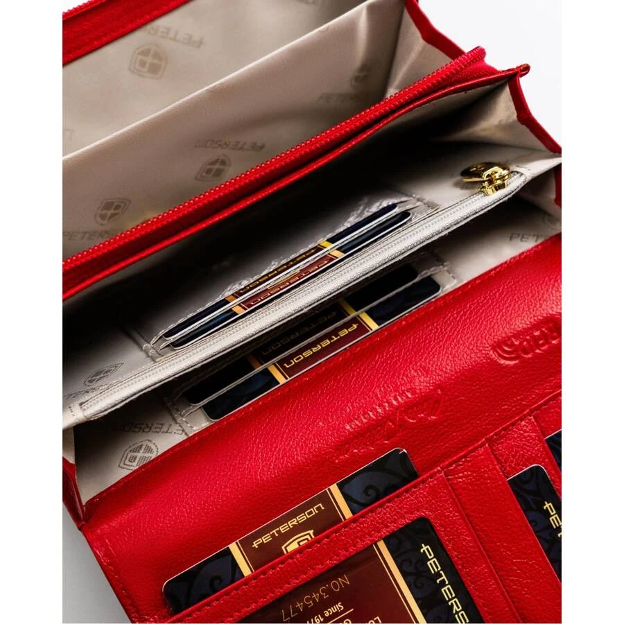 Czerwony portfel damski Peterson wykonany z wysokiej jakości skóry naturalnej i lakierowanej łączy elegancję z funkcjonalnością. Poziomy fason z zatrzaskiem i licznymi przegródkami na karty, dokumenty oraz bilon gwarantuje porządek i wygodę codziennego użytkowania. Dzięki systemowi RFID Twoje dane są zawsze bezpieczne. Idealny wybór dla kobiet ceniących styl, praktyczność i nowoczesne zabezpieczenia.