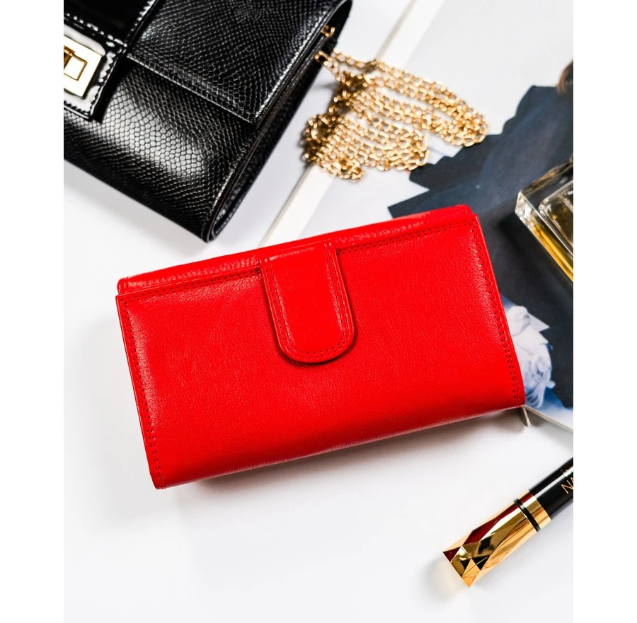 Duży portfel damski Rovicky wykonany z wysokiej jakości skóry naturalnej w eleganckim czerwonym kolorze. Wyposażony w liczne przegrody na karty, dokumenty i banknoty oraz praktyczną kieszeń na suwak na bilon. Stylowy, pojemny i funkcjonalny – idealny na co dzień lub jako prezent dla kobiety ceniącej jakość i klasyczny design.