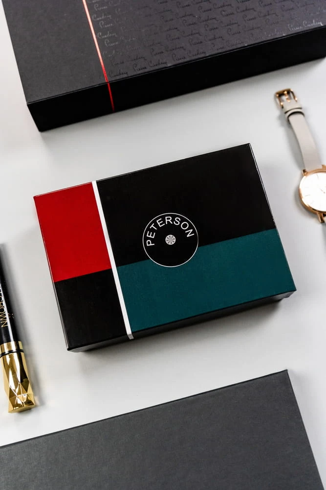 Zapakowany w pudełko o stylowym połączeniu czerwieni, zieleni i czerni, z centralnie umieszczonym logo. Idealne do estetycznego zapakowania portfela, nadając mu schludny i elegancki wygląd.