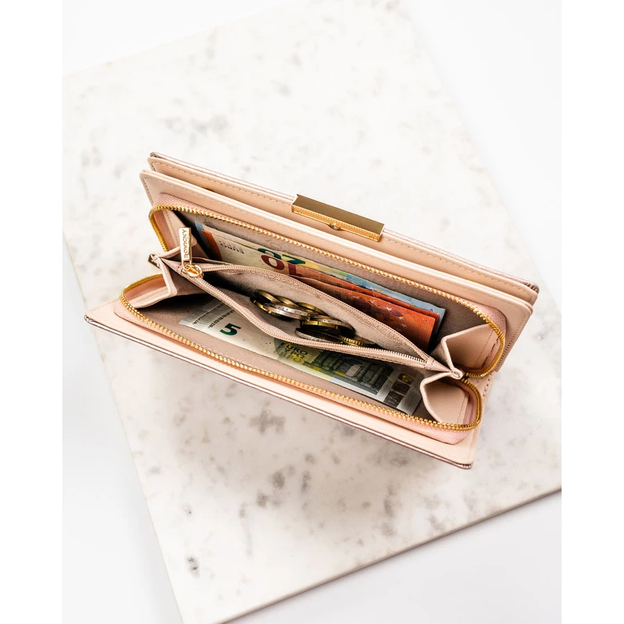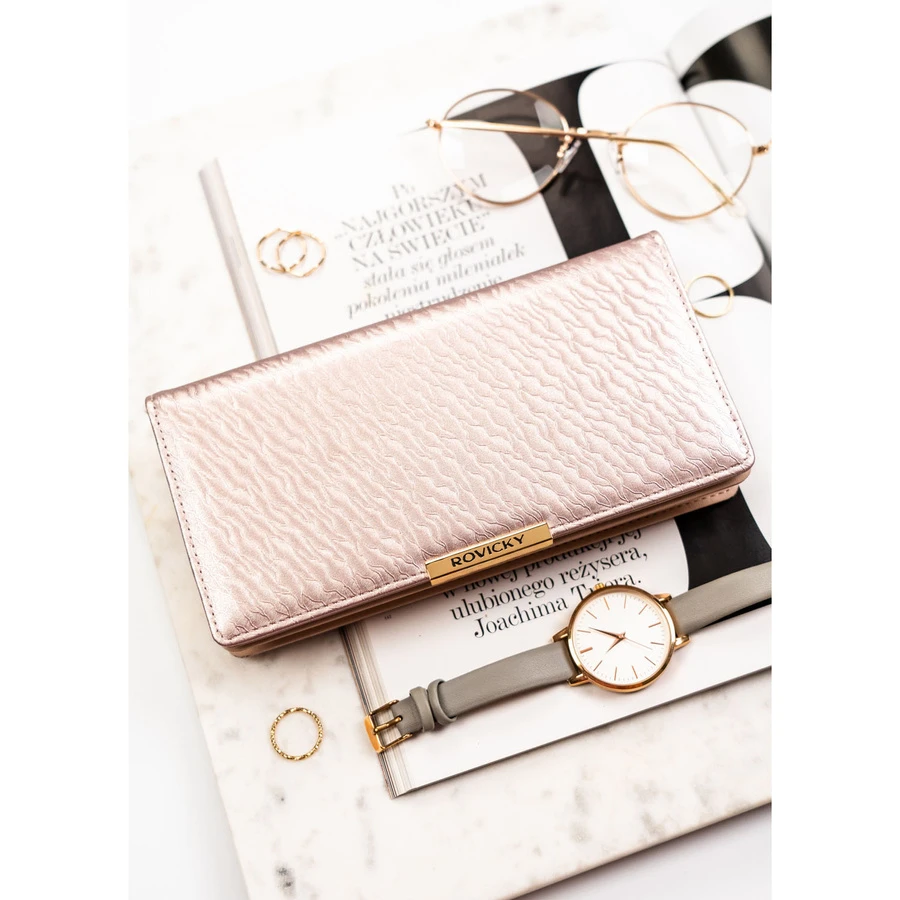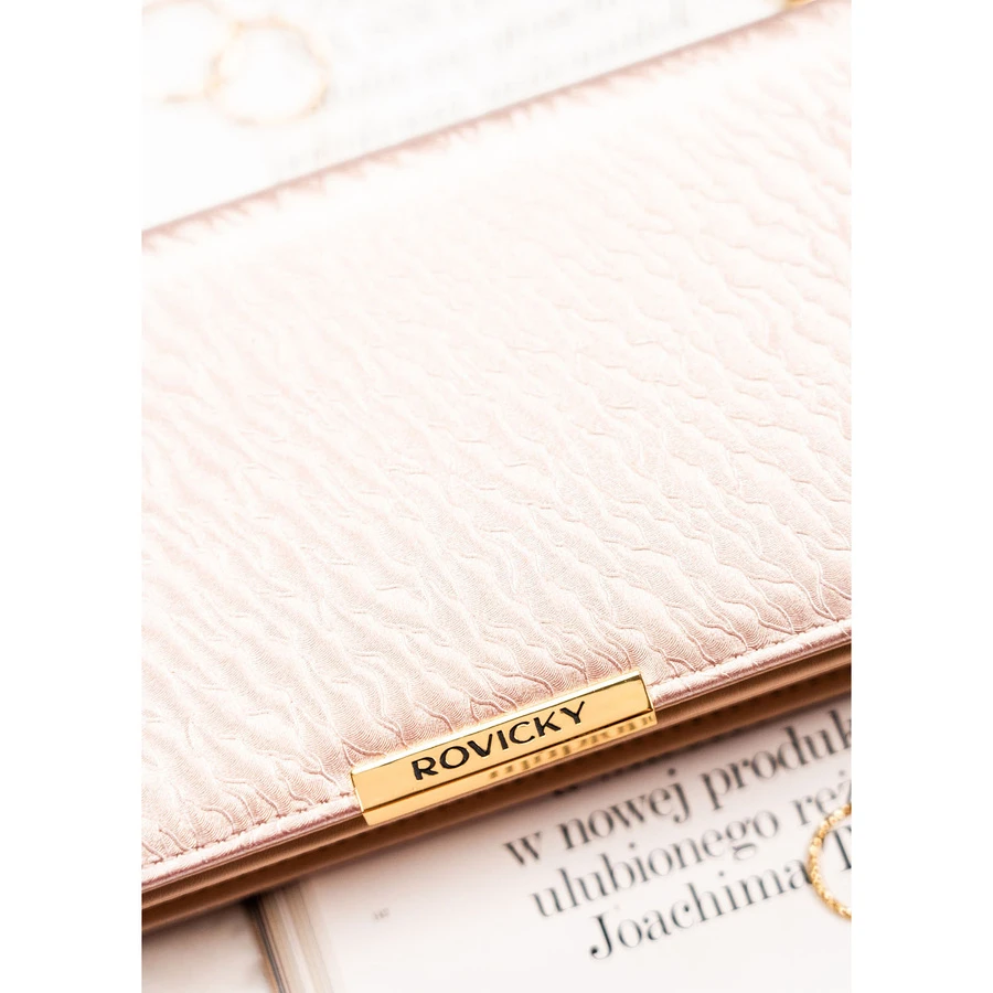 Portfel damski Rovicky to propozycja dla kobiet ceniących połączenie klasy, wygody i nowoczesnych rozwiązań. Jego dopracowany design oraz perfekcyjne wykończenie przyciągają uwagę, a ergonomiczny, poziomy układ sprawia, że każdy drobiazg znajduje swoje miejsce.