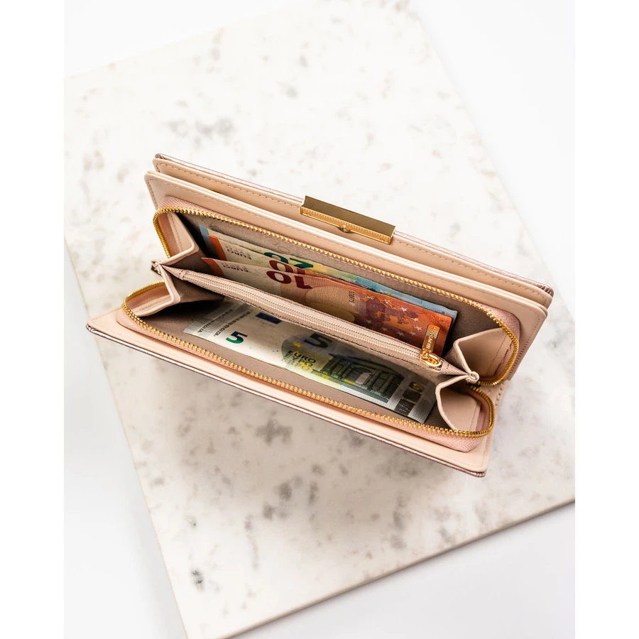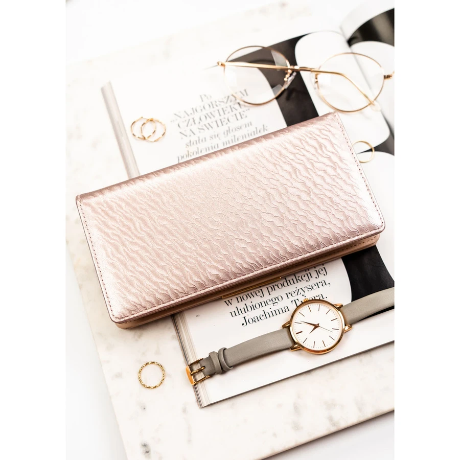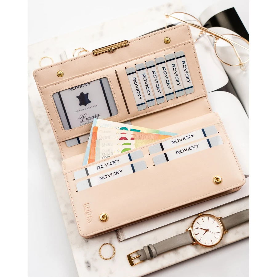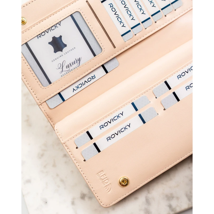 Duży, beżowy portfel damski ze skóry ekologicznej wyposażony w system RFID - Rovicky