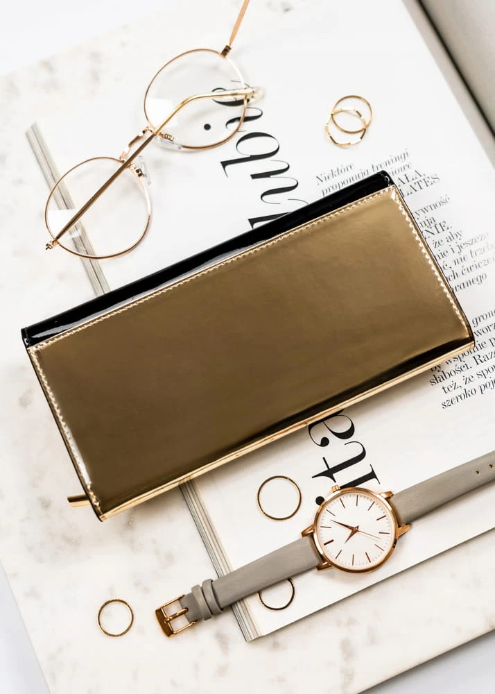 - Klasyczna konstrukcja | Portfel o orientacji poziomej, zamykany na zatrzask;