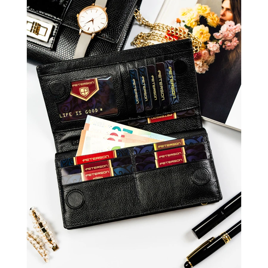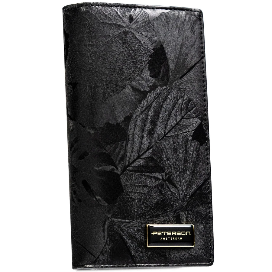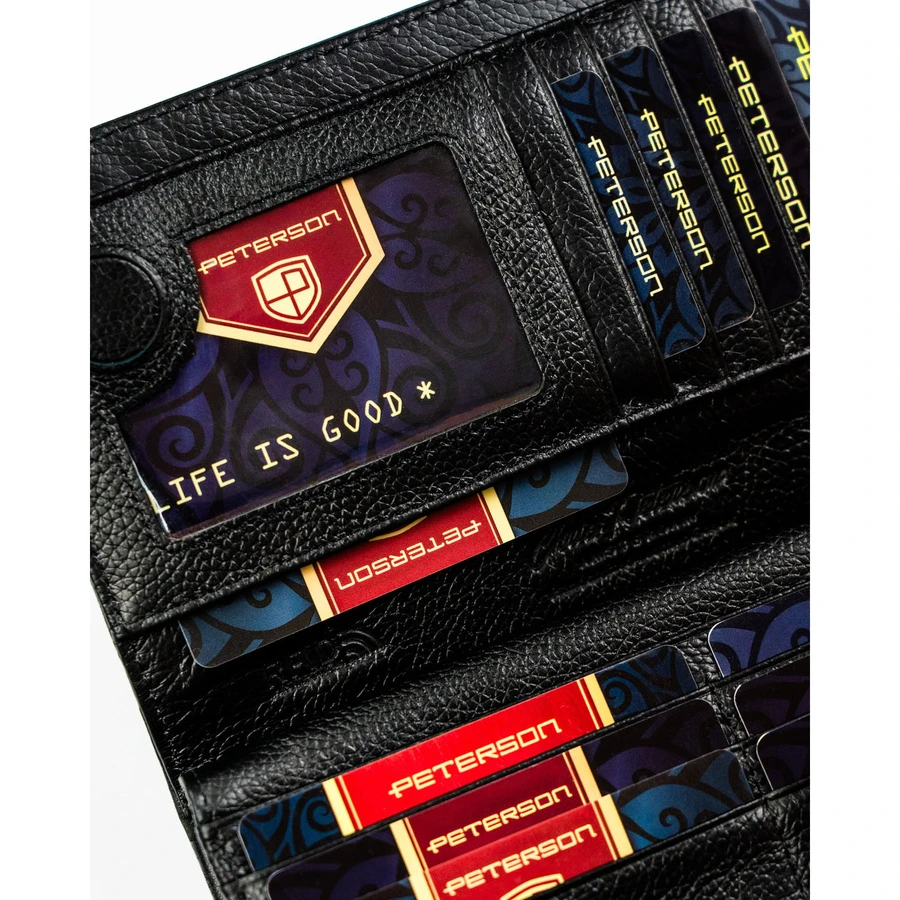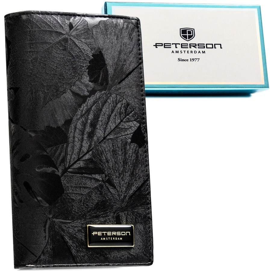 Duży, pionowy portfel damski w czarnym kolorze zamykany na magnes i suwak - Peterson