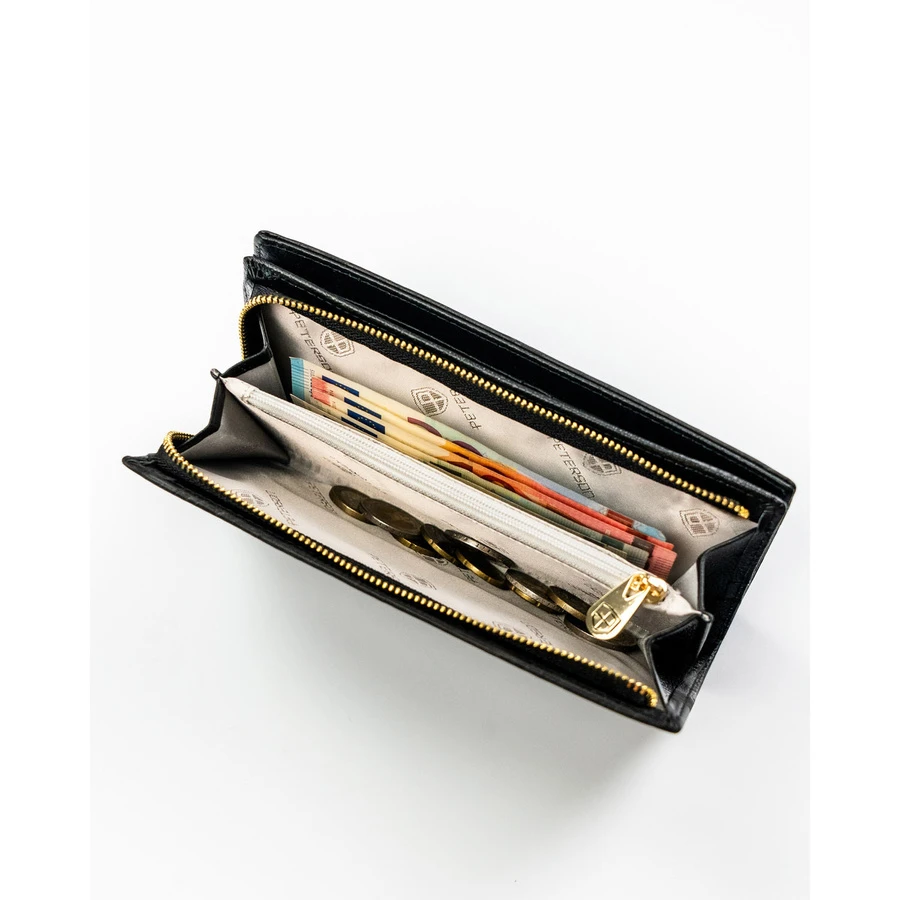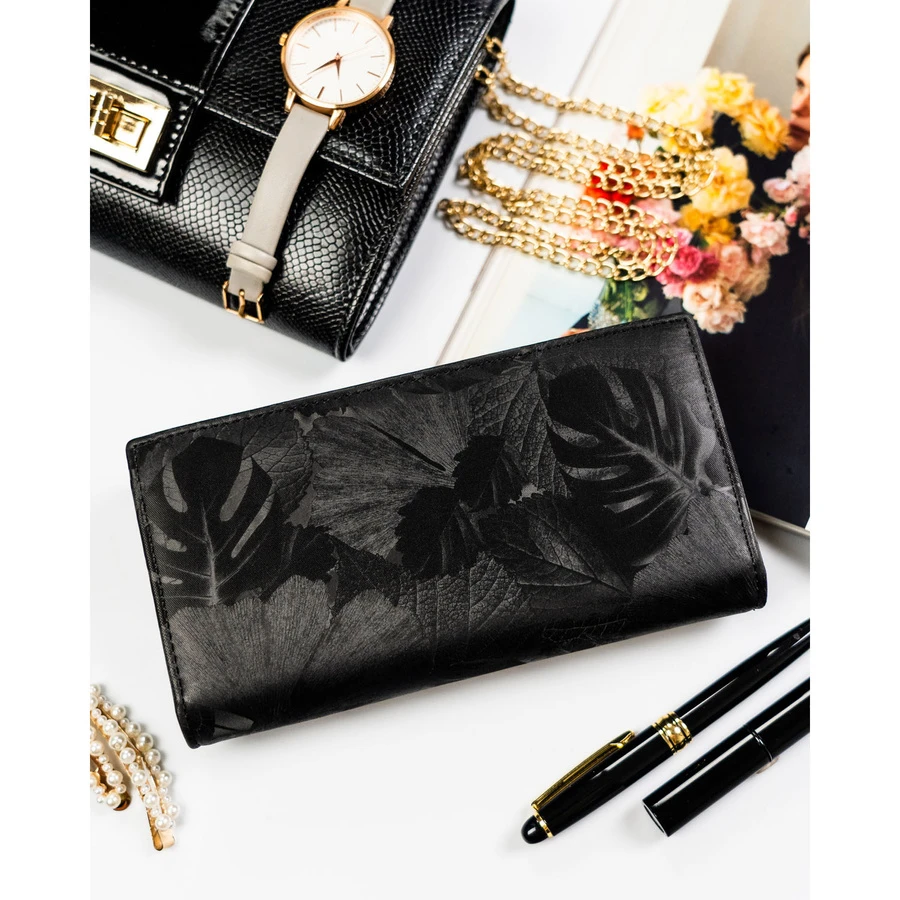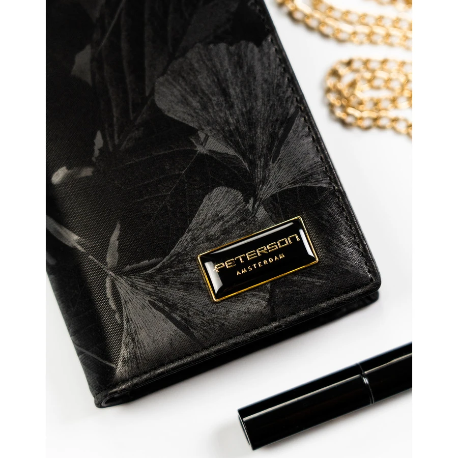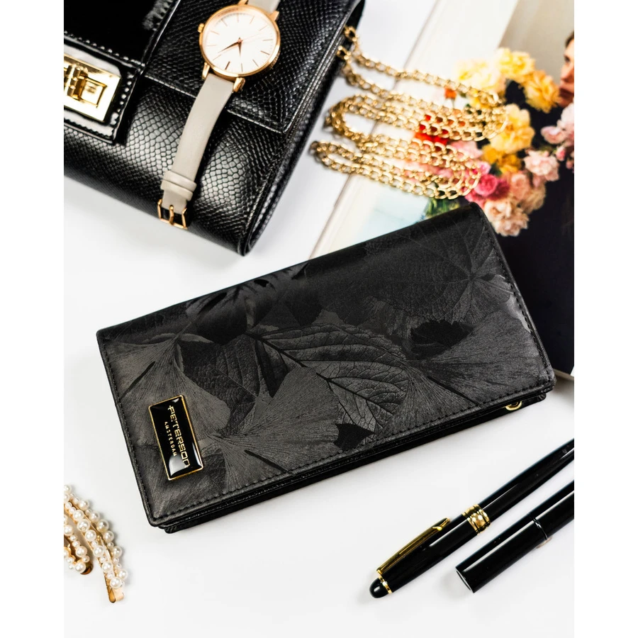 Duży, pionowy portfel damski w czarnym kolorze zamykany na magnes i suwak - Peterson