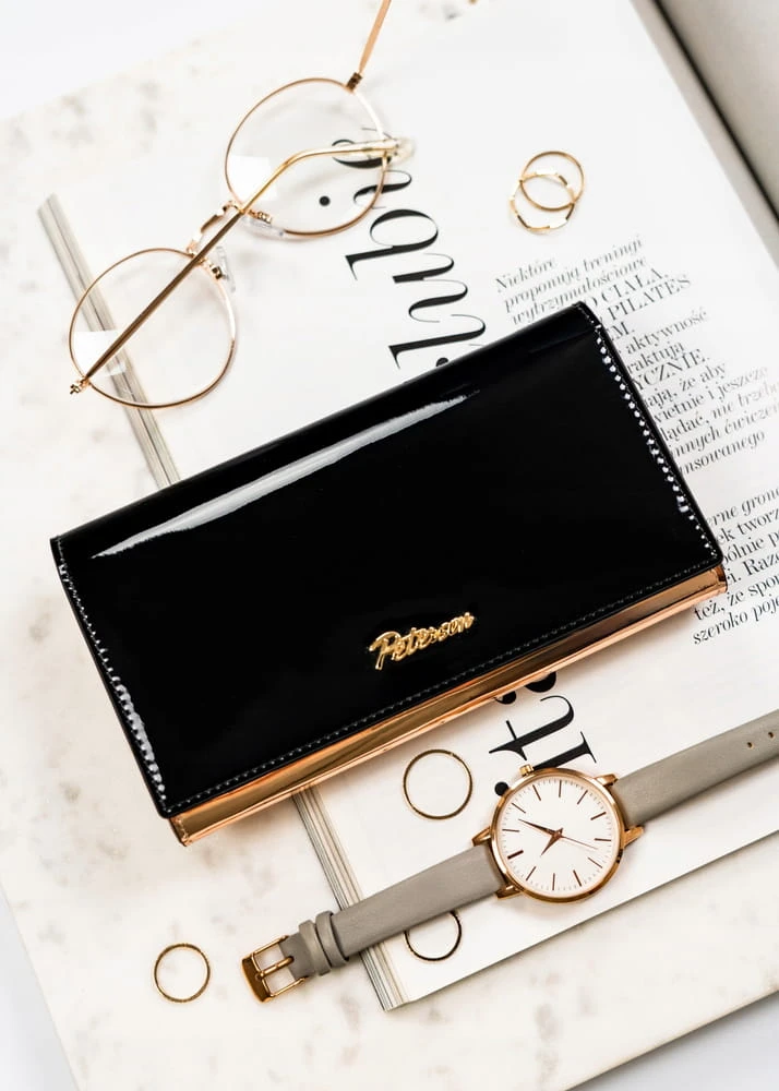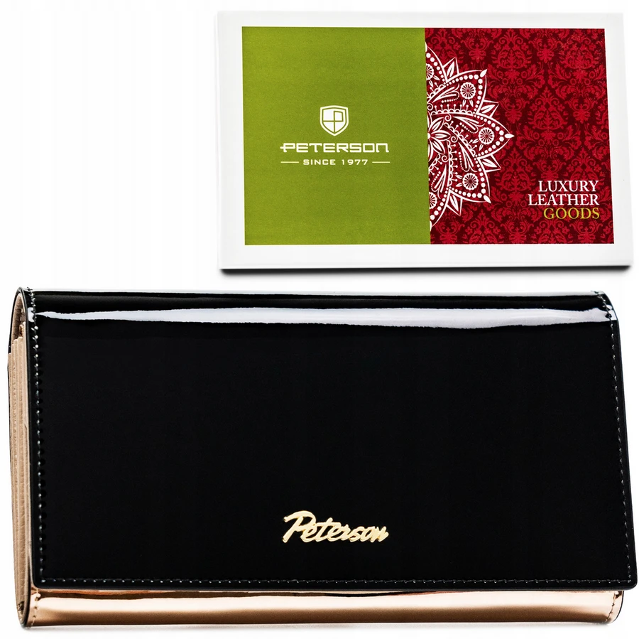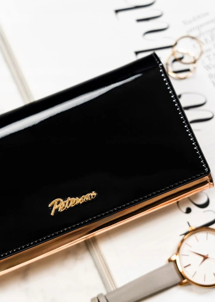 Duży, poziomy portfel damski w kolorze czarno-złotym zamykany na zatrzask - Peterson