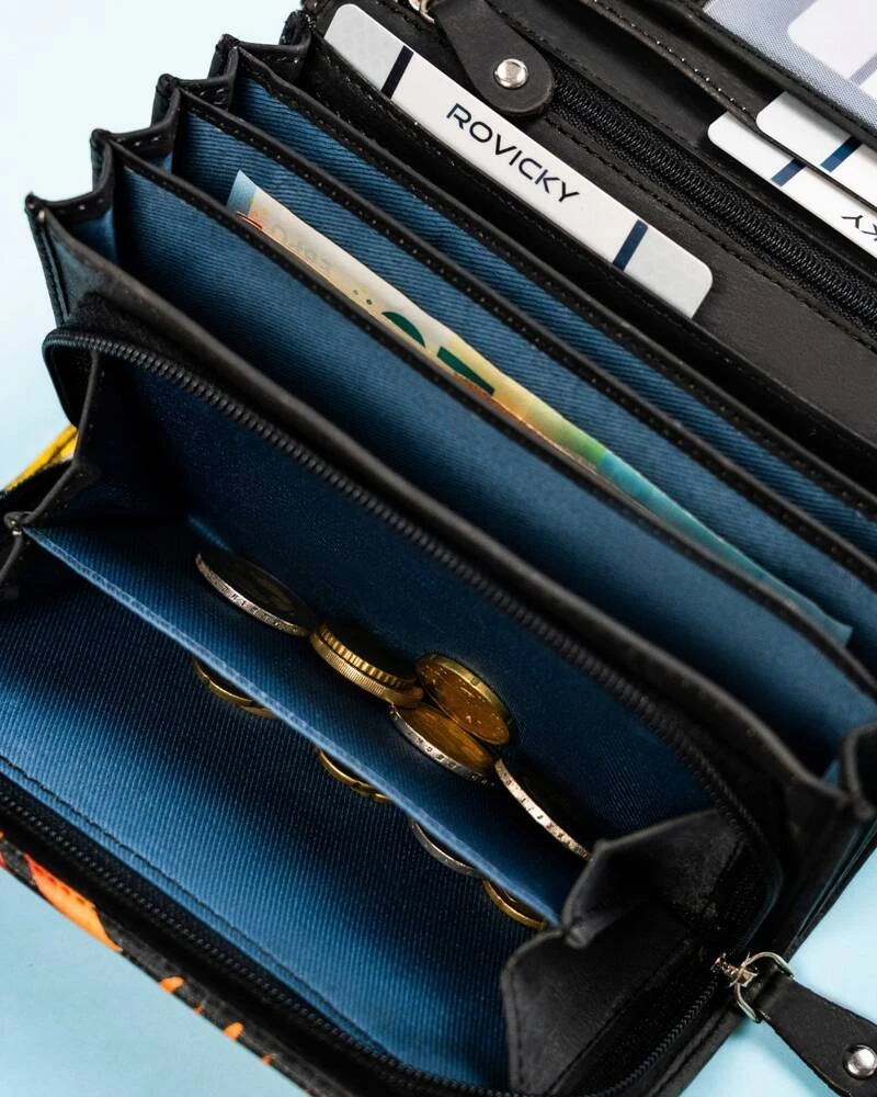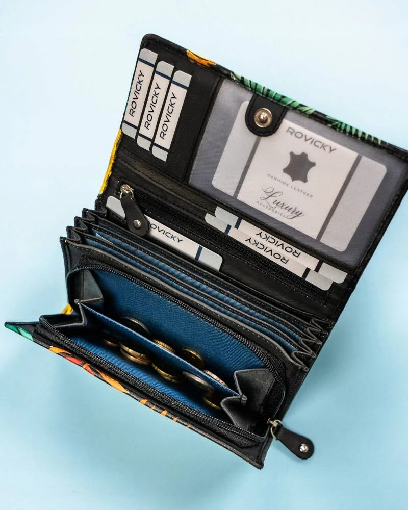 Dzięki liczebności schowków portfel idealnie nada się do przechowywania kilku walut. Bez problemu możesz je rozdzielić, aby nie uległy pomieszaniu.