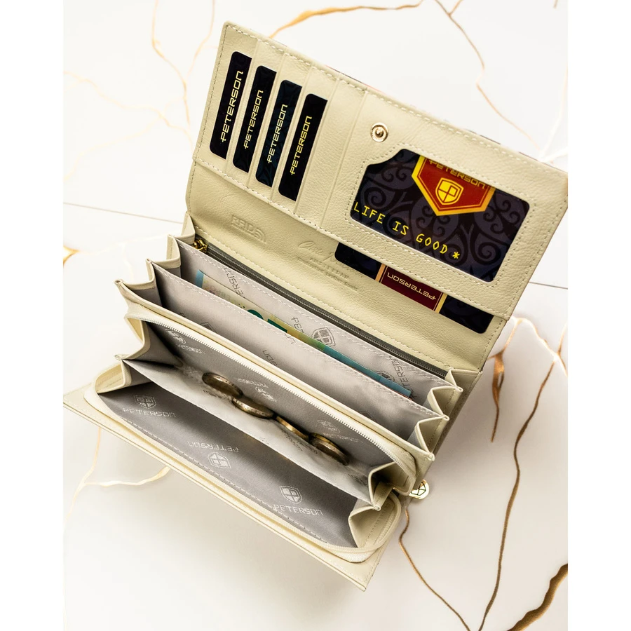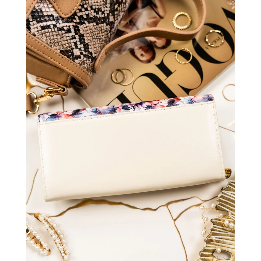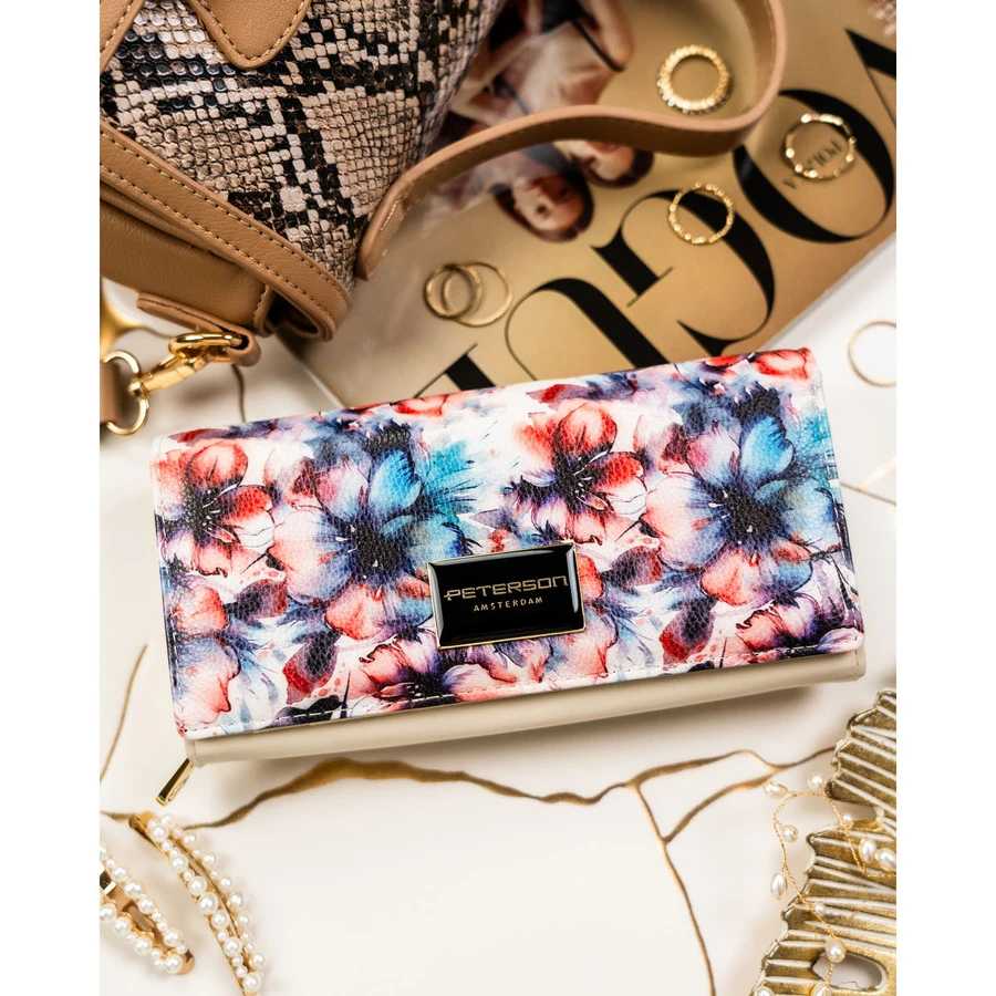 Duży portfel damski w kwiaty wykonany ze skóry naturalnej i ekologicznej, zamykany zatrzaskiem - Peterson