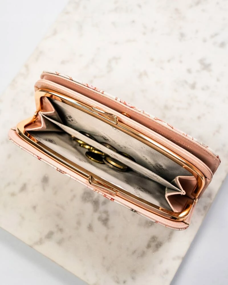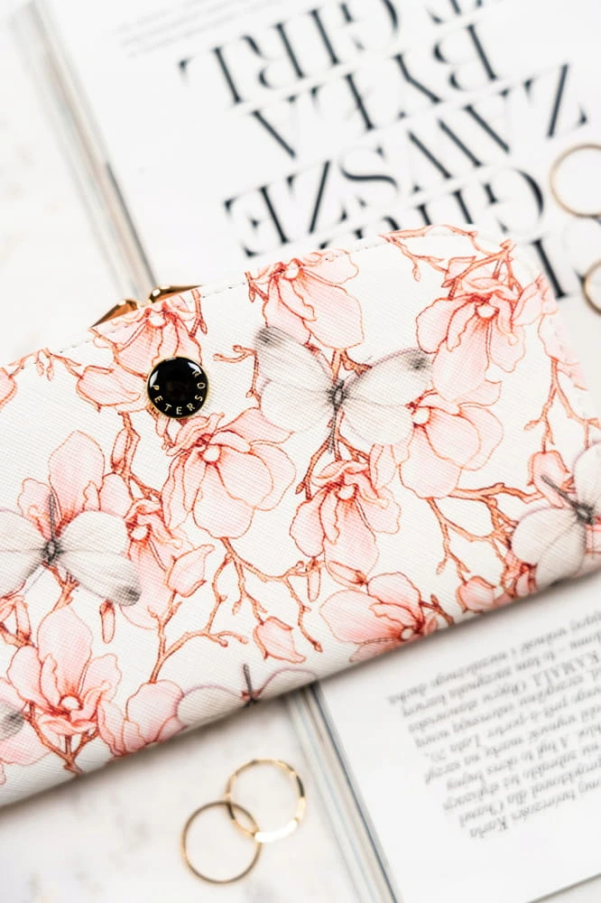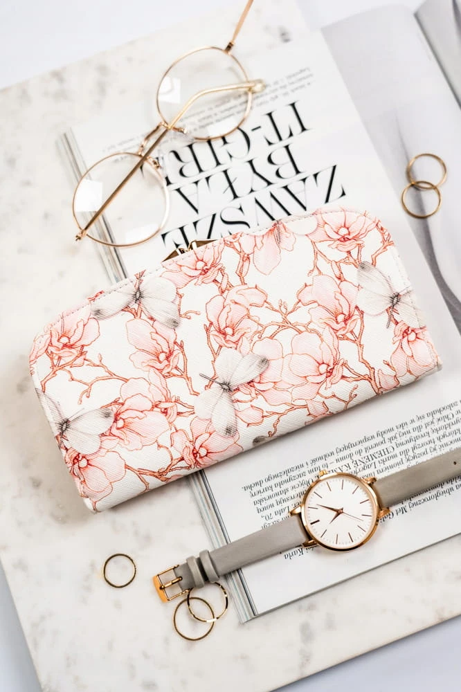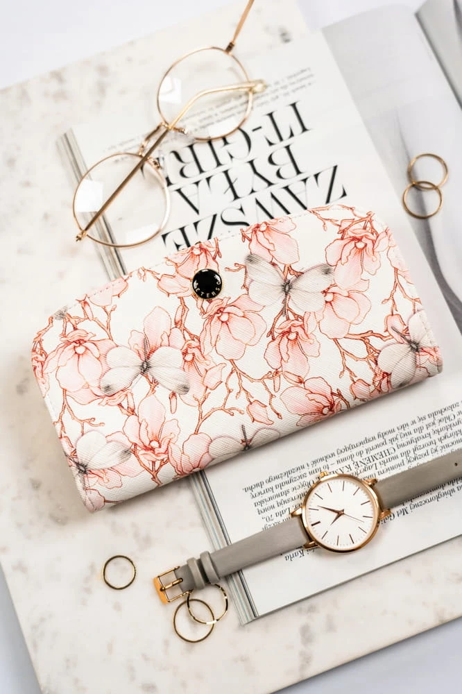- Materiał i design | Portfel został uszyty z wytrzymałej skóry ekologicznej ozdobionej pięknym, kwiatowym motywem;