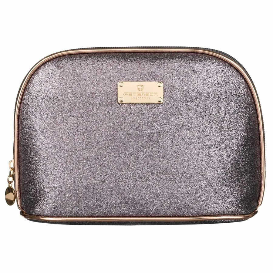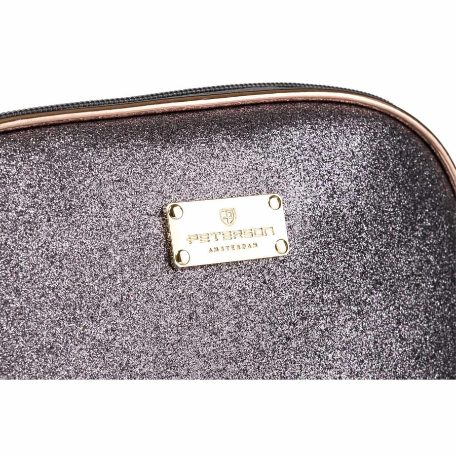 Elegancka kosmetyczka wykonana z materiału ozdobionego brokatem w kolorze czarnym. Lamówka w kolorze różowego złota podkreśla kolorystykę materiału. Zapięcie suwaka ozdobione okrągłą, metalową przywieszką.