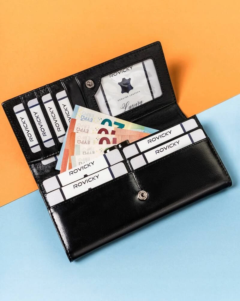 - Czarny kolor | Portfel w uniwersalnym, czarnym kolorze i gładkiej fakturze;