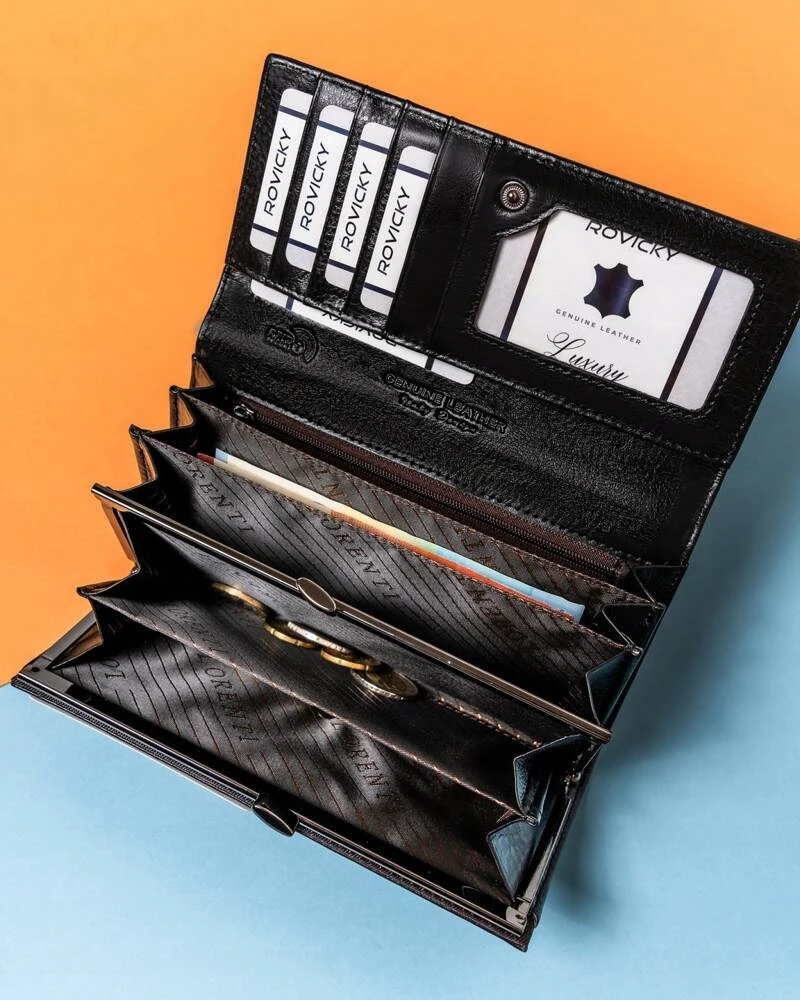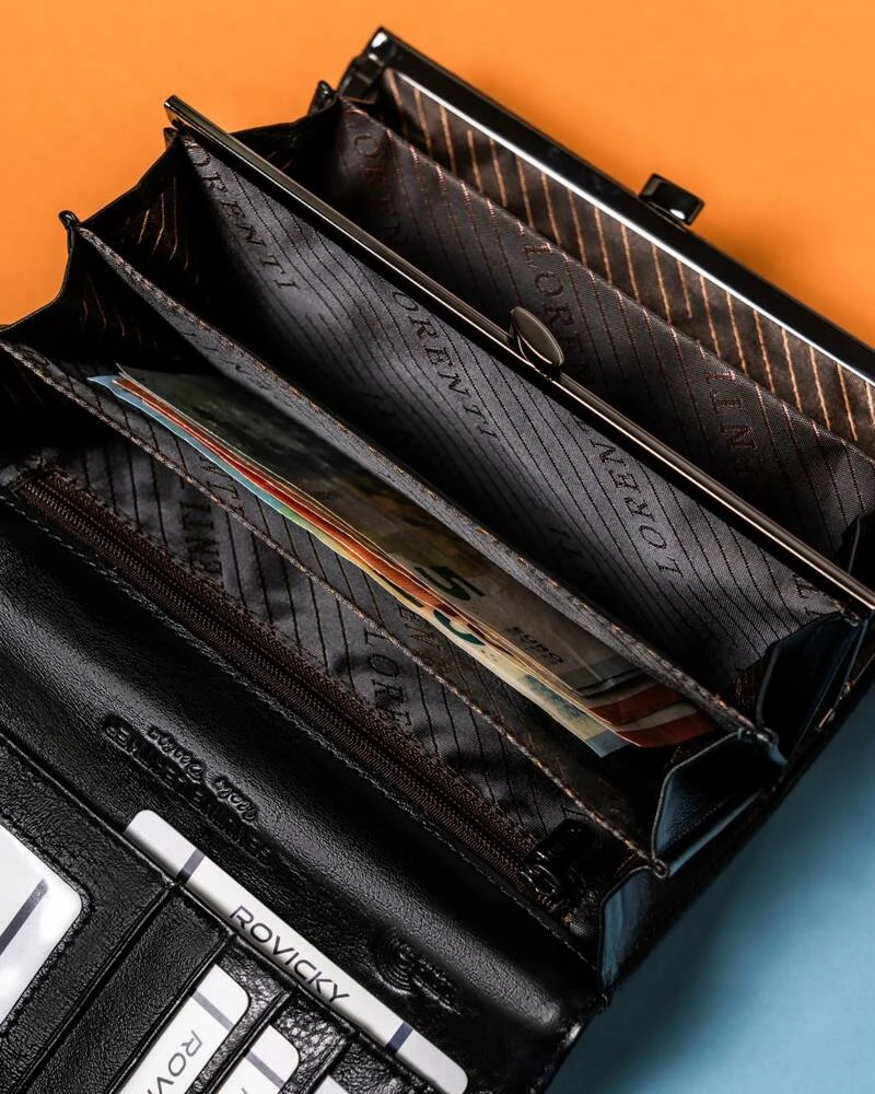 - 2 kieszenie na dokumenty. Jedna mieści się wewnątrz, schowana pod przegródkami na karty i miejscem na fotografię. Druga jest po zewnętrznej stronie. Zalecamy jednak, by ważne dokumenty przechowywać wewnątrz, zapinanego zatrzaskiem portfela;