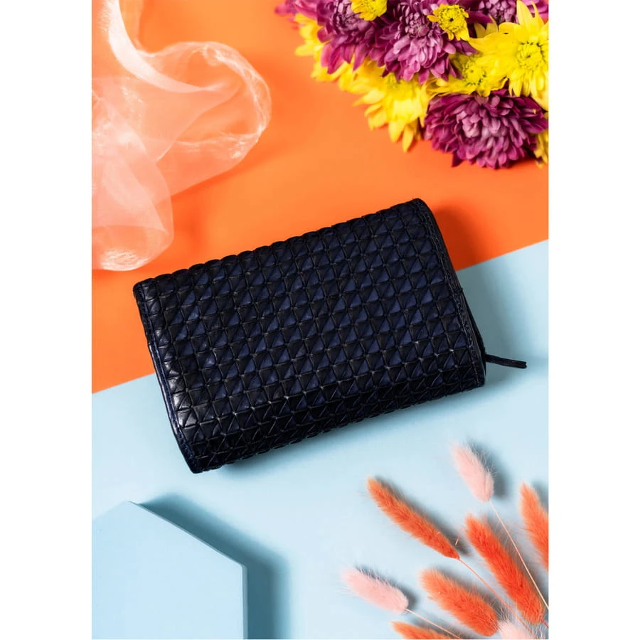 - Jego unikalny charakter podkreślają precyzyjnie przeplecione paski ze skóry na powierzchni, tworzące efekt trójwymiarowej tekstury w geometryczny wzór. Wypukłe kształty dodają elegancji i wyróżniają produkt na tle innych akcesoriów.