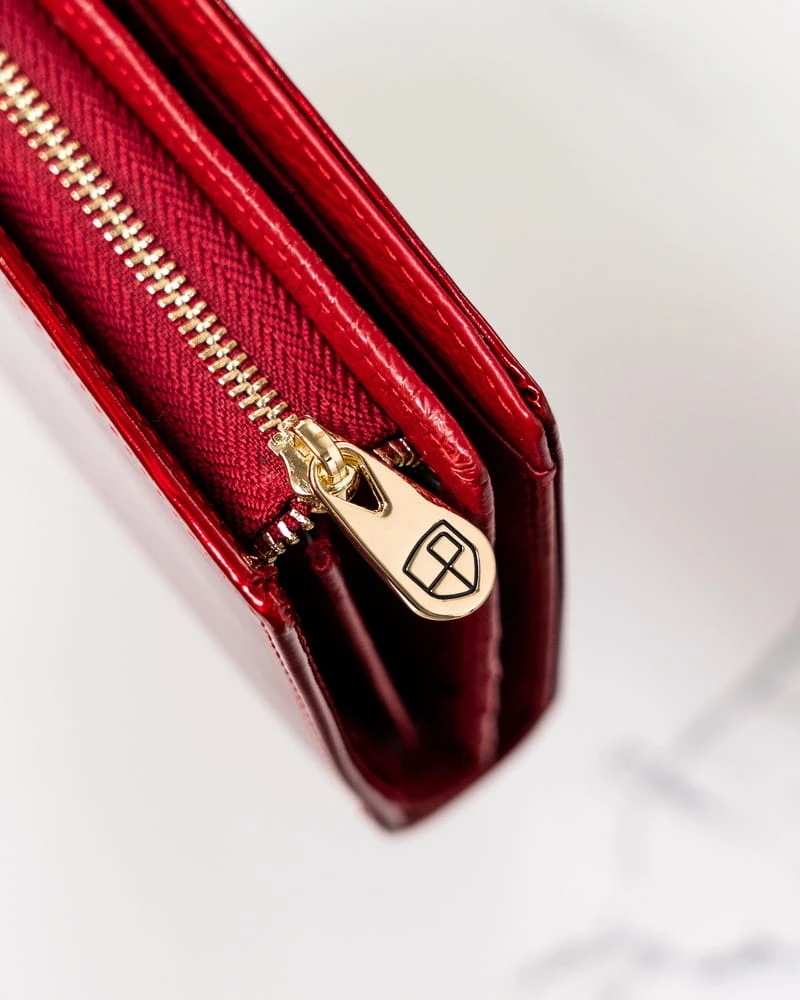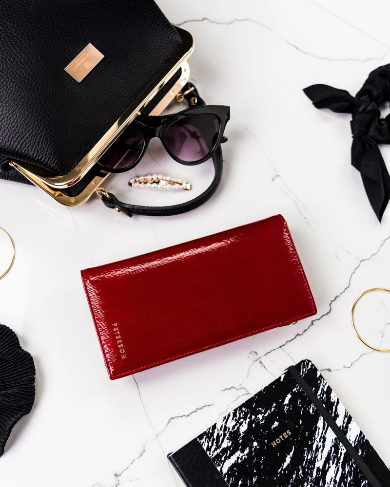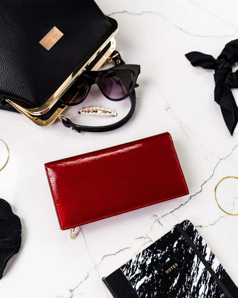- Portfel ze skóry najwyższej jakości | Uszyty z lakierowanej skóry naturalnej, bardzo trwałej i przyjemnej w dotyku. Na zewnątrz ma gładką fakturę, w środku jej powierzchnia jest matowa i żyłowana.