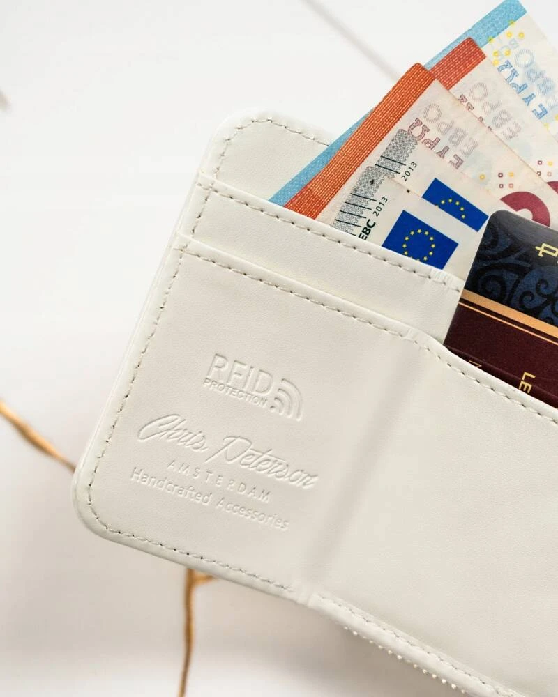 - 1 podwójnej kieszeni zamykanej na zamek błyskawiczny. Kieszeń ta jest oddzielną sekcją portfela.