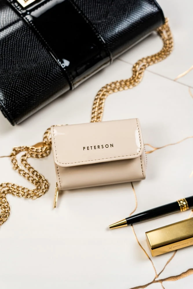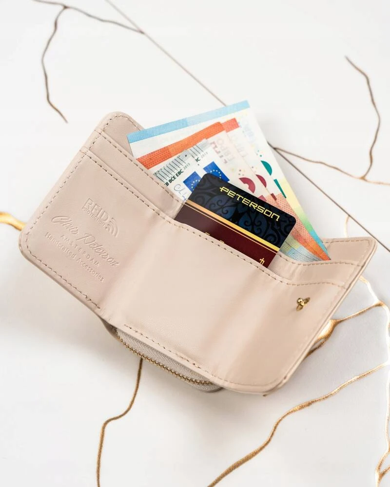 - 1 podwójnej kieszeni zamykanej na zamek błyskawiczny. Kieszeń ta jest oddzielną sekcją portfela.