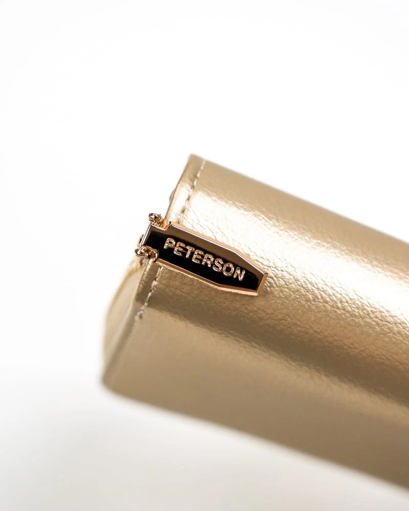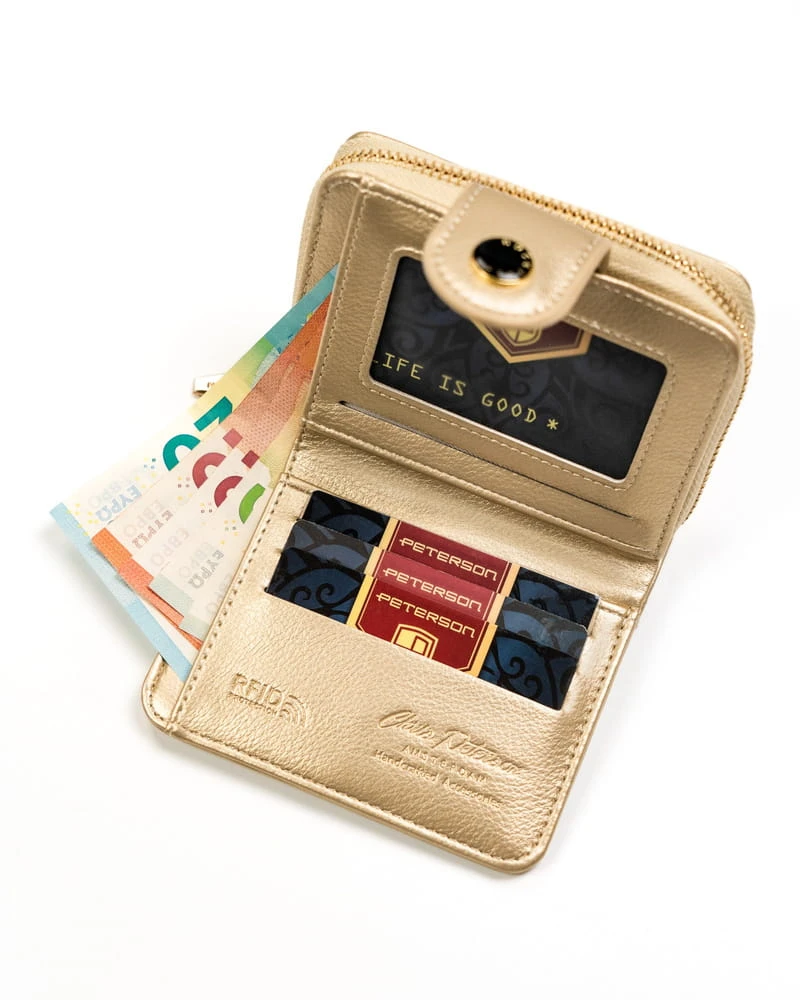 - 1 podwójnej kieszeni zamykanej na suwak. Kieszeń ta jest oddzielną sekcją portfela, a dodatkowo w przegródce rozdzielającej dwie komory wyszyto 1 kieszonkę na ważniejsze drobiazgi.