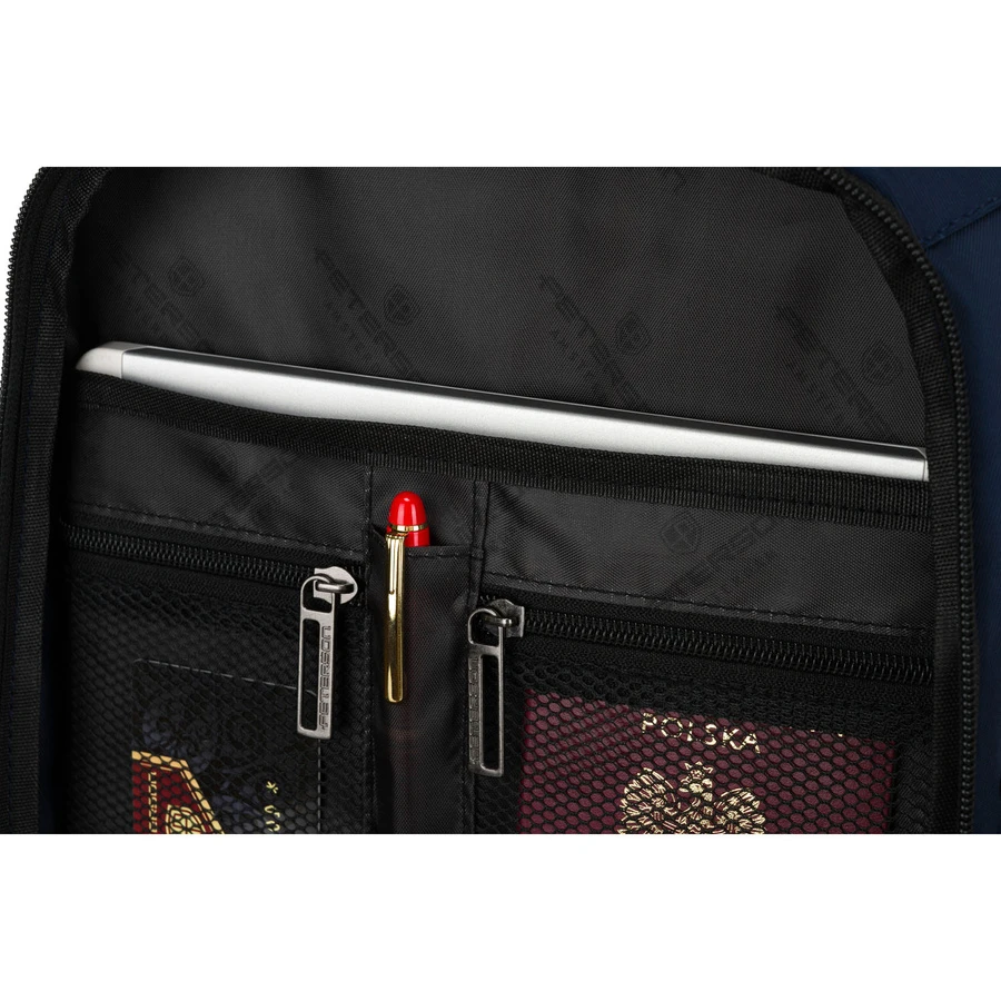 - 3 zasuwane kieszenie z siatki – na powerbank, słuchawki, kosmetyki czy kartę pokładową.