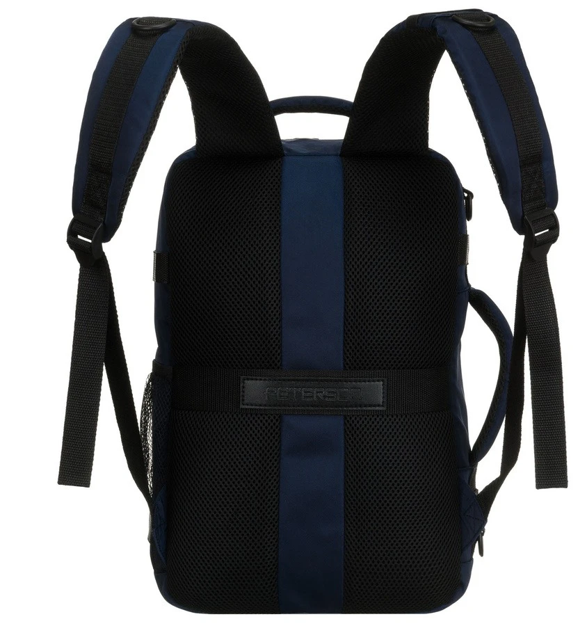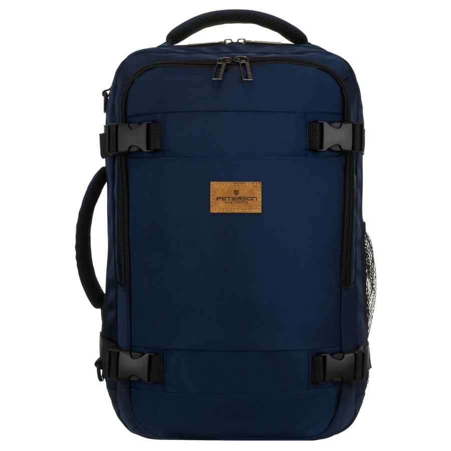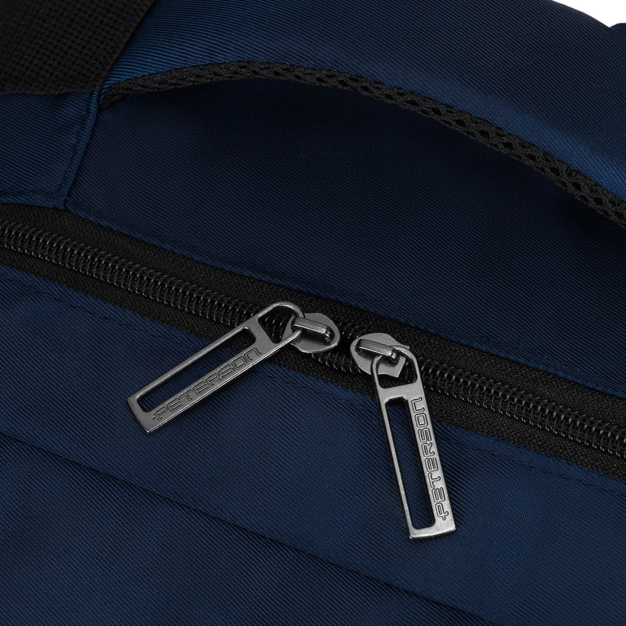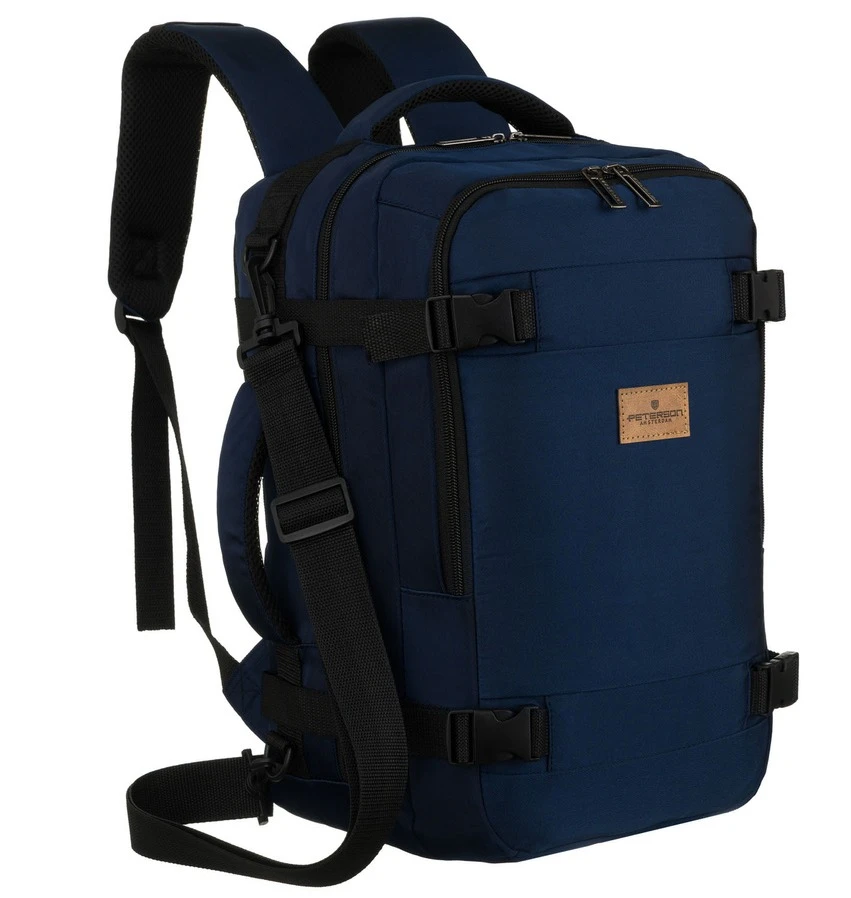 Dwukomorowy plecak podróżny w granatowym kolorze marki Peterson, idealny jako bagaż podręczny. Wyposażony w główną komorę z pasami zabezpieczającymi oraz drugą komorę na dokumenty i drobiazgi. Oddychająca siatka 3D mesh na plecach i szelkach oraz regulowany pasek na ramię zapewniają komfort noszenia podczas podróży.