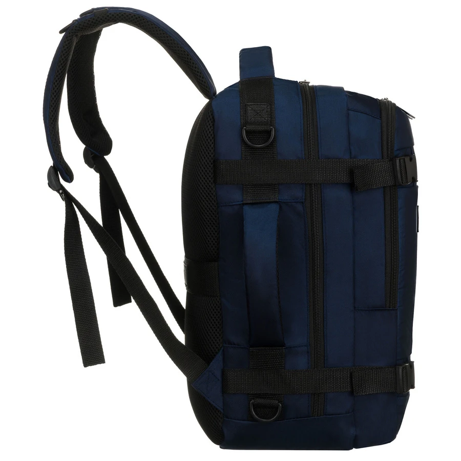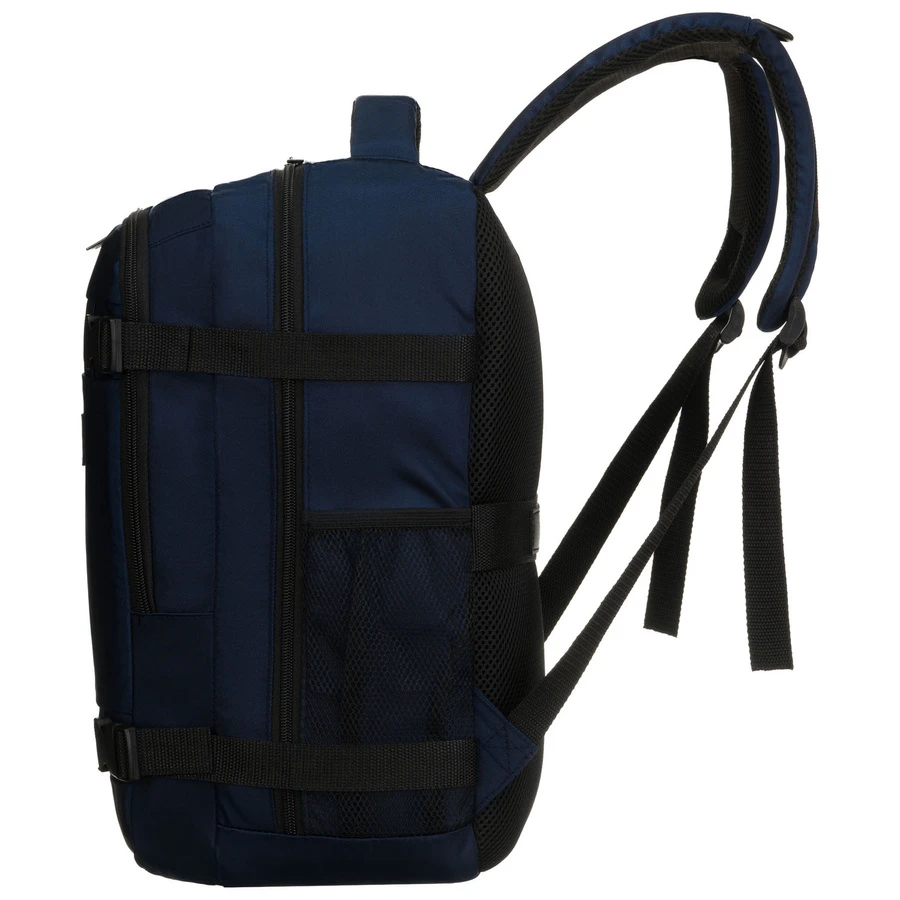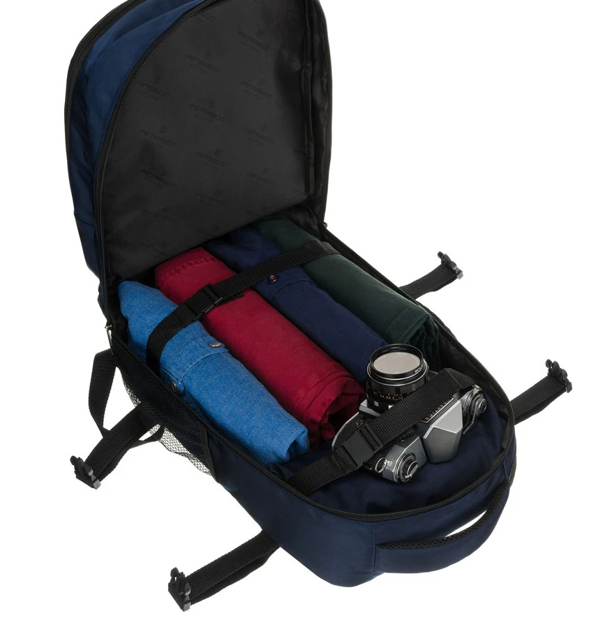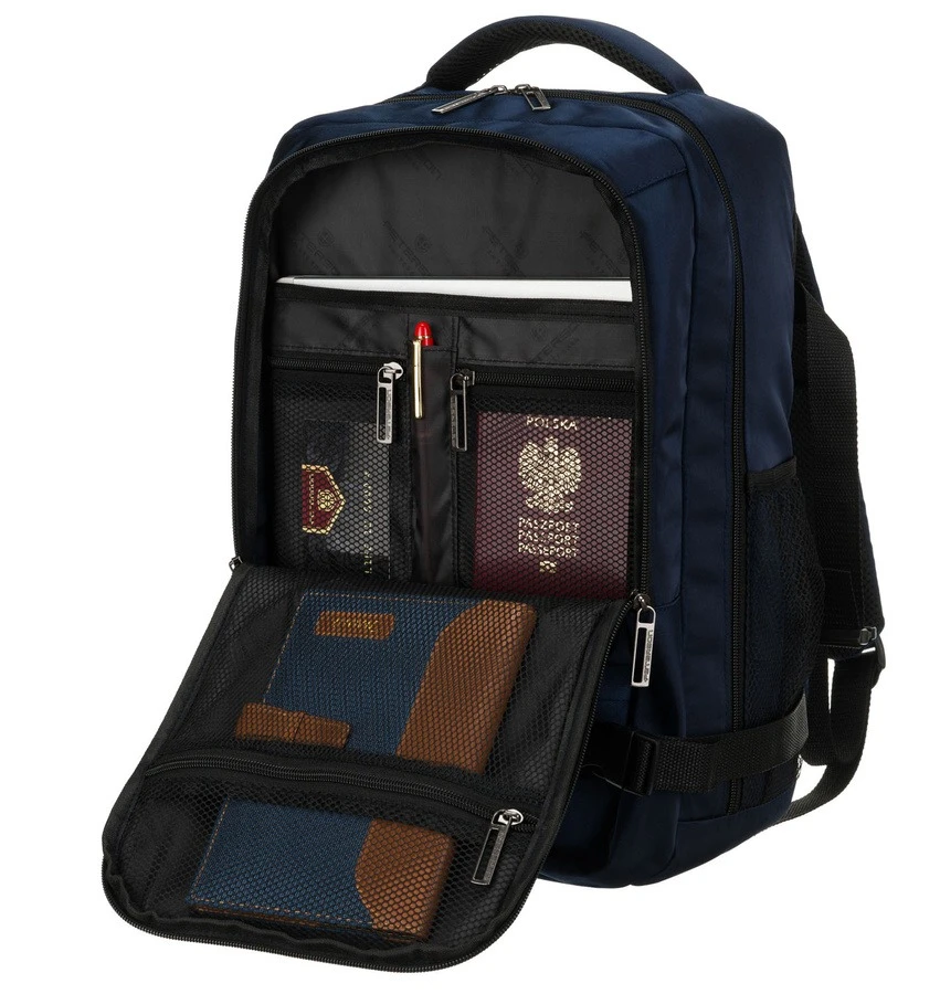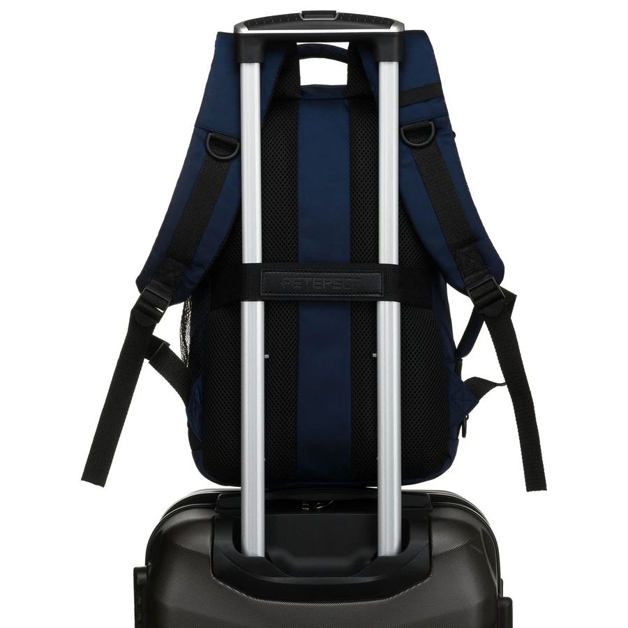 Dwukomorowy plecak podróżny w granatowym kolorze marki Peterson, idealny jako bagaż podręczny. Wyposażony w główną komorę z pasami zabezpieczającymi oraz drugą komorę na dokumenty i drobiazgi. Oddychająca siatka 3D mesh na plecach i szelkach oraz regulowany pasek na ramię zapewniają komfort noszenia podczas podróży.