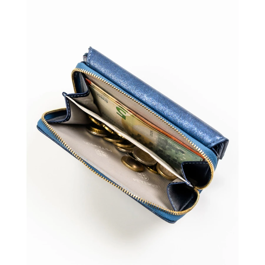 - Praktyczna, podwójna kieszeń na monety zabezpieczona suwakiem.