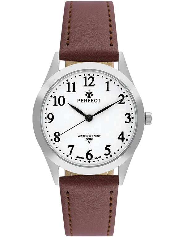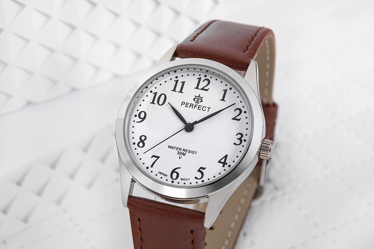 Skórzany pasek tego zegarka to kwintesencja klasy i wygody. Wykonany z najwyższej jakości materiału, komfortowo dopasowuje się do nadgarstka, oferując nie tylko trwałość, ale też elegancki wygląd. Jego miękkość zapewnia komfort noszenia na co dzień, a perfekcyjne wykończenie podkreśla charakterystyczny styl marki Perfect.