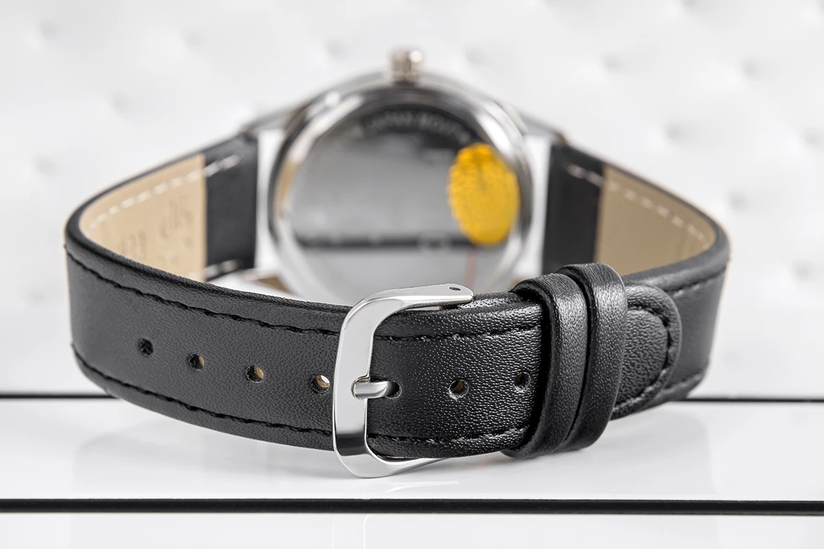 Ten zegarek to esencja minimalistycznej elegancji. Srebrna koperta otula białą tarczę, emanując czystością i świeżością. Czarne indeksy oraz wskazówki dodają wyrazistości, a czarny sekundnik wprowadza dynamikę do tej harmonijnej kompozycji. Czarny pasek, wykończony subtelną czarną nitką, nadaje nowoczesnego charakteru i komfortu noszenia.