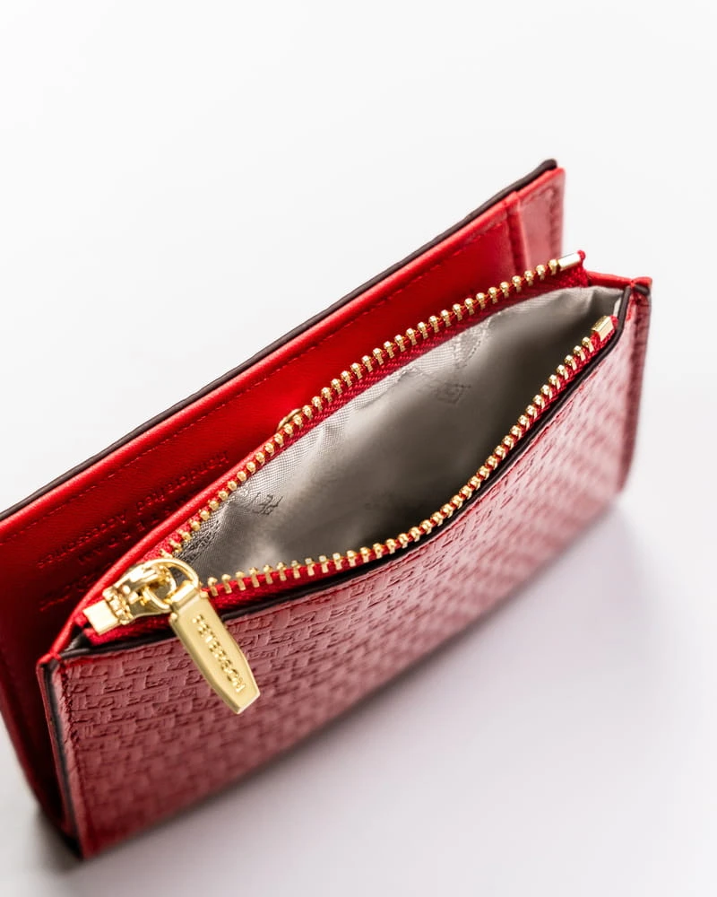 Portfel odszyty bardzo trwale z doskonałej jakości skóry ekologicznej. Surowiec jest bardzo przyjemny w dotyku i do złudzenia przypomina naturalną skórę bydlęcą. Model stosunkowo niewielkich rozmiarów - idealny do małych torebek. Ponadczasowy fason dopełniony złotymi okuciami. Model w orientacji poziomej, zamykany na zatrzask. Front ozdobiony złotym logo marki.