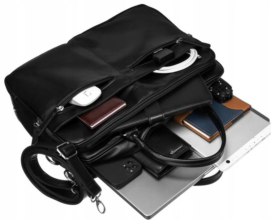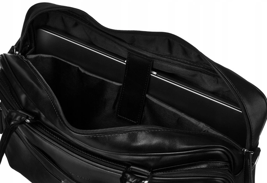 Męska torba na laptopa do 14 cali wykonana ze skóry ekologicznej – Peterson, czarna z regulowanym paskiem i uchwytami