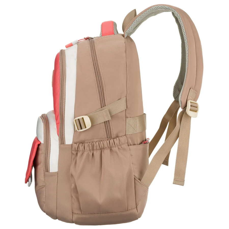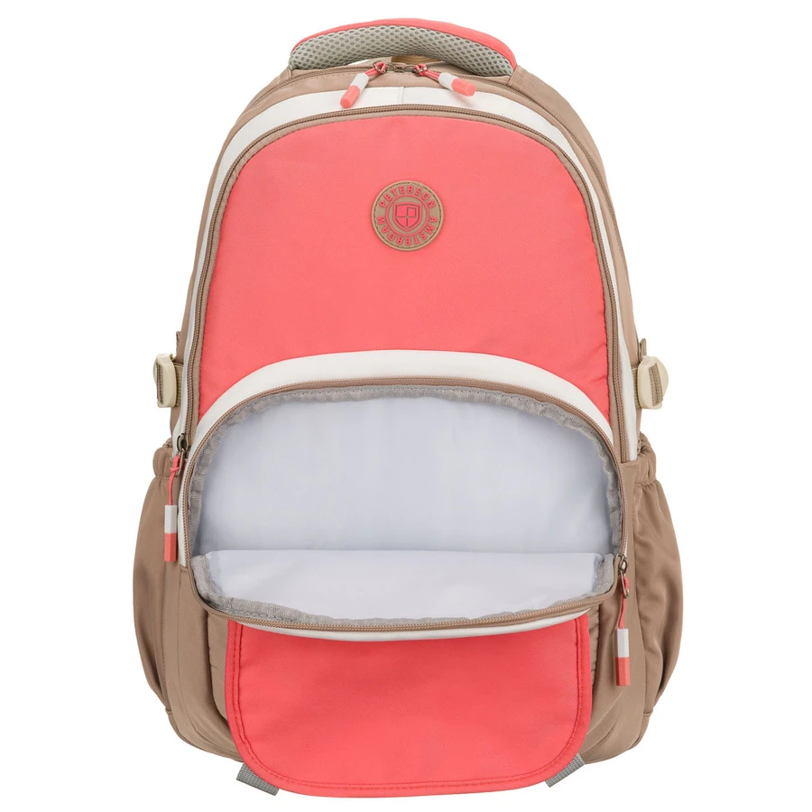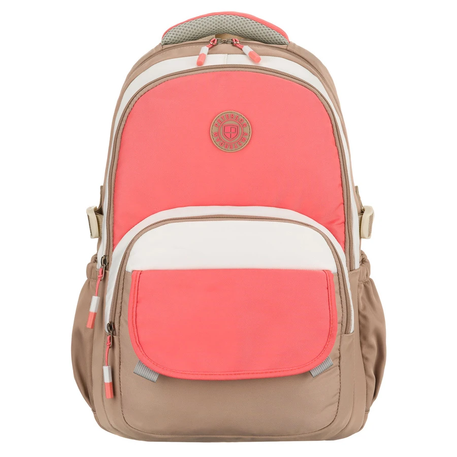 Młodzieżowy plecak szkolny Peterson w modnym beżowo-różowym kolorze, wykonany z wytrzymałego poliestru. Posiada 2 pojemne komory, w tym wyściełaną przegrodę na laptopa do 15,6”. Funkcjonalne 6 kieszeni, w tym bezpieczną, ukrytą z tyłu oraz boczne elastyczne na napoje. Wyposażony w regulowane pasy kompresyjne, wygodne szelki i pasek mocujący na walizkę — idealny na codzienne zajęcia i wycieczki szkolne.
