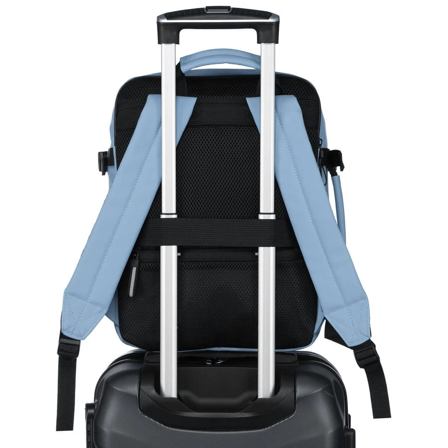 Plecak został wyposażony w specjalny pasek na tylnej stronie, który umożliwia bezpieczne zamocowanie go na rączce walizki podróżnej. Dzięki temu możesz go przewozić komfortowo na bagażu, unikając niepotrzebnego noszenia. To rozwiązanie doskonale sprawdza się podczas lotniskowych transferów, podróży służbowych czy długich przejść na dworcach.
